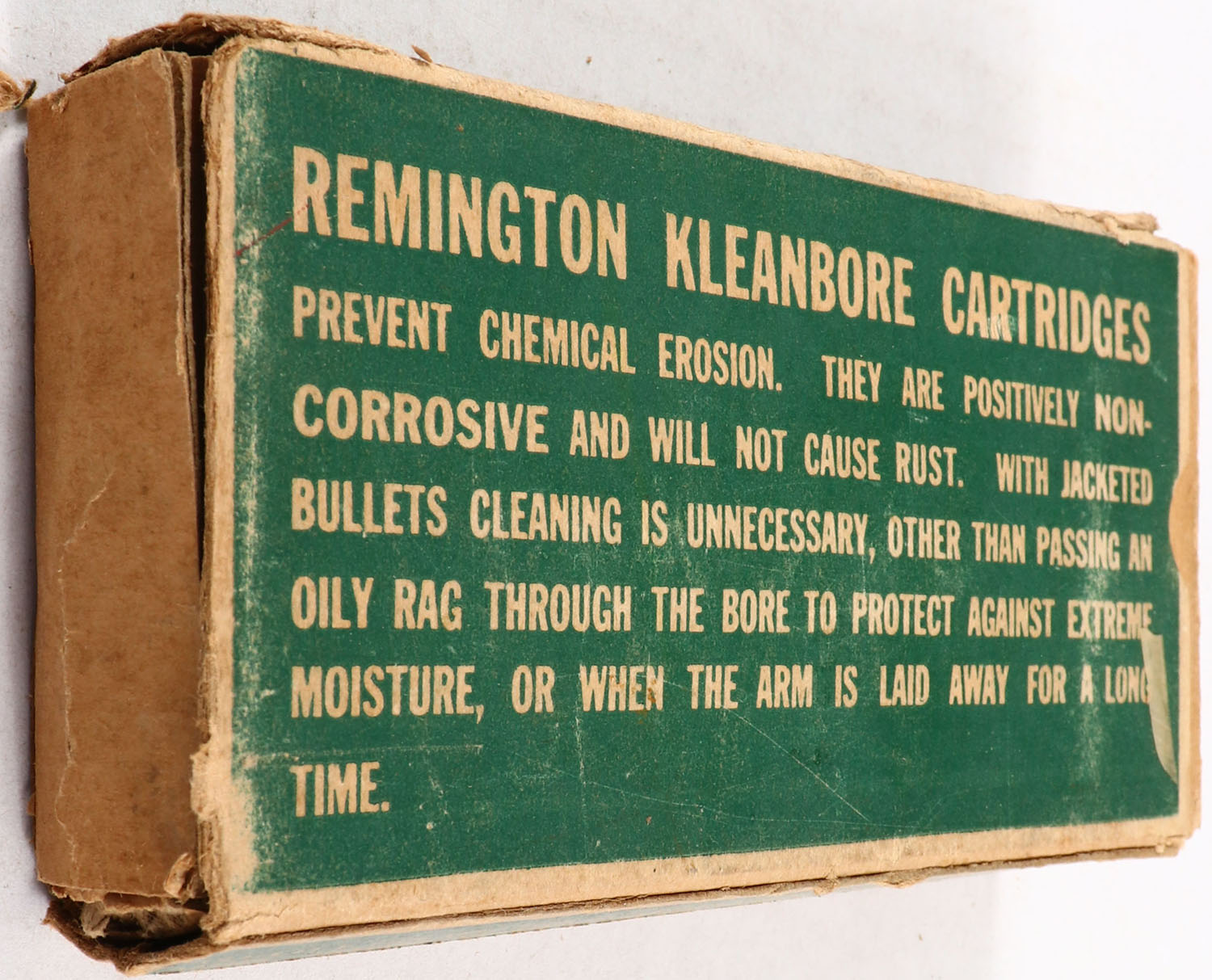 Remington, Kleanbore, .30 Remington, 170 Gr. Soft Point, Full, 1pc. Green white & red dog bone box, right end flap is torn, box has seam splits with scuffing, edge & corner wear, ammo is very good. Grade: Good - Value: 20 to 60