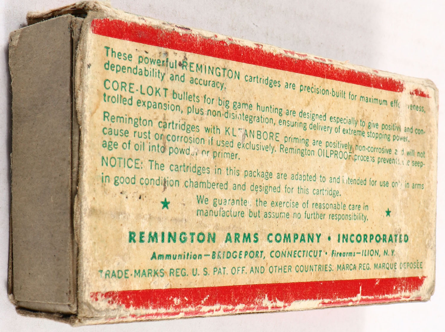 Remington, Kleanbore Express, .300 Savage, 180 Grain Pointed Soft Point Core-Lokt Bullet, Full, 1pc. Green white & red box, box is solid with good color, has age soiling with edge & corner wear, right end flap is missing, ammo is excellent. Grade: Good ++ - Value: 20 to 60