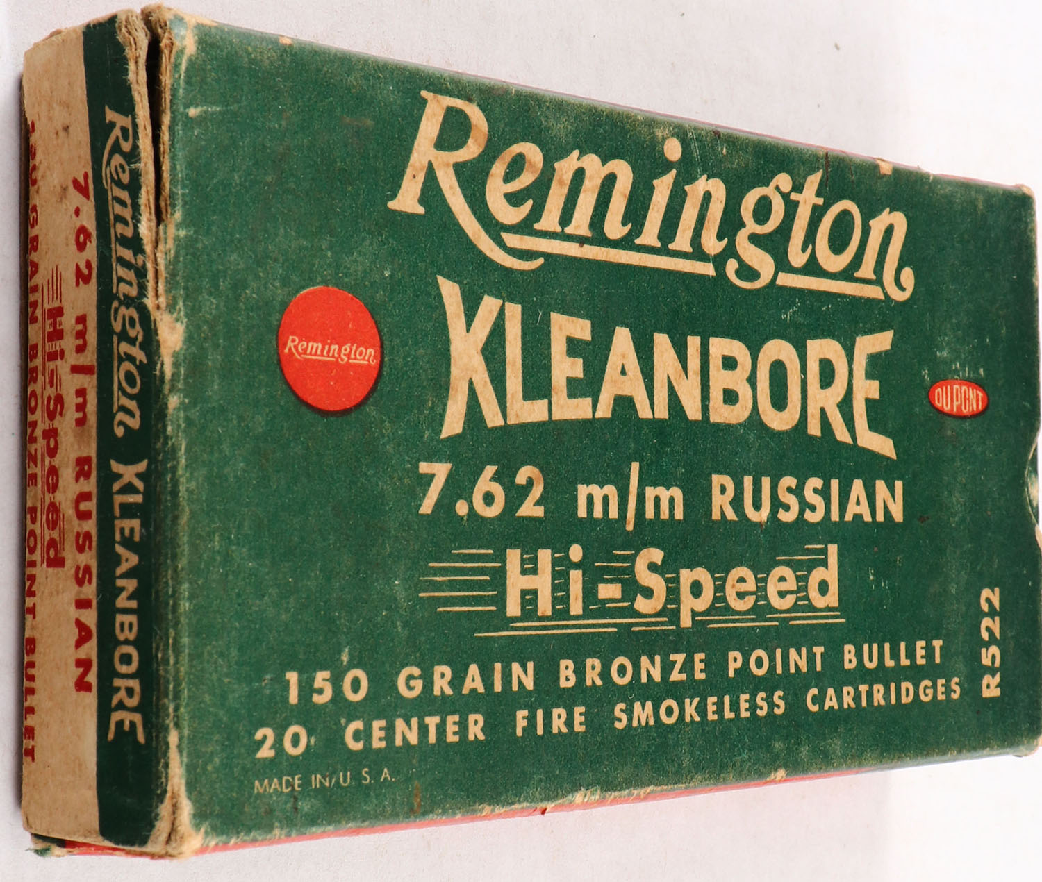 Remington, Kleanbore, 7.62mm Russian, 150Gr Bronze Pointed Bullet, For remington Russia rifle & other arms, 1pc, Full, Green White & red box, box is solid with light age soiling, edge wear & light rub marks, ammo is excellent. Grade: Very Good + - Value: 20 to 60