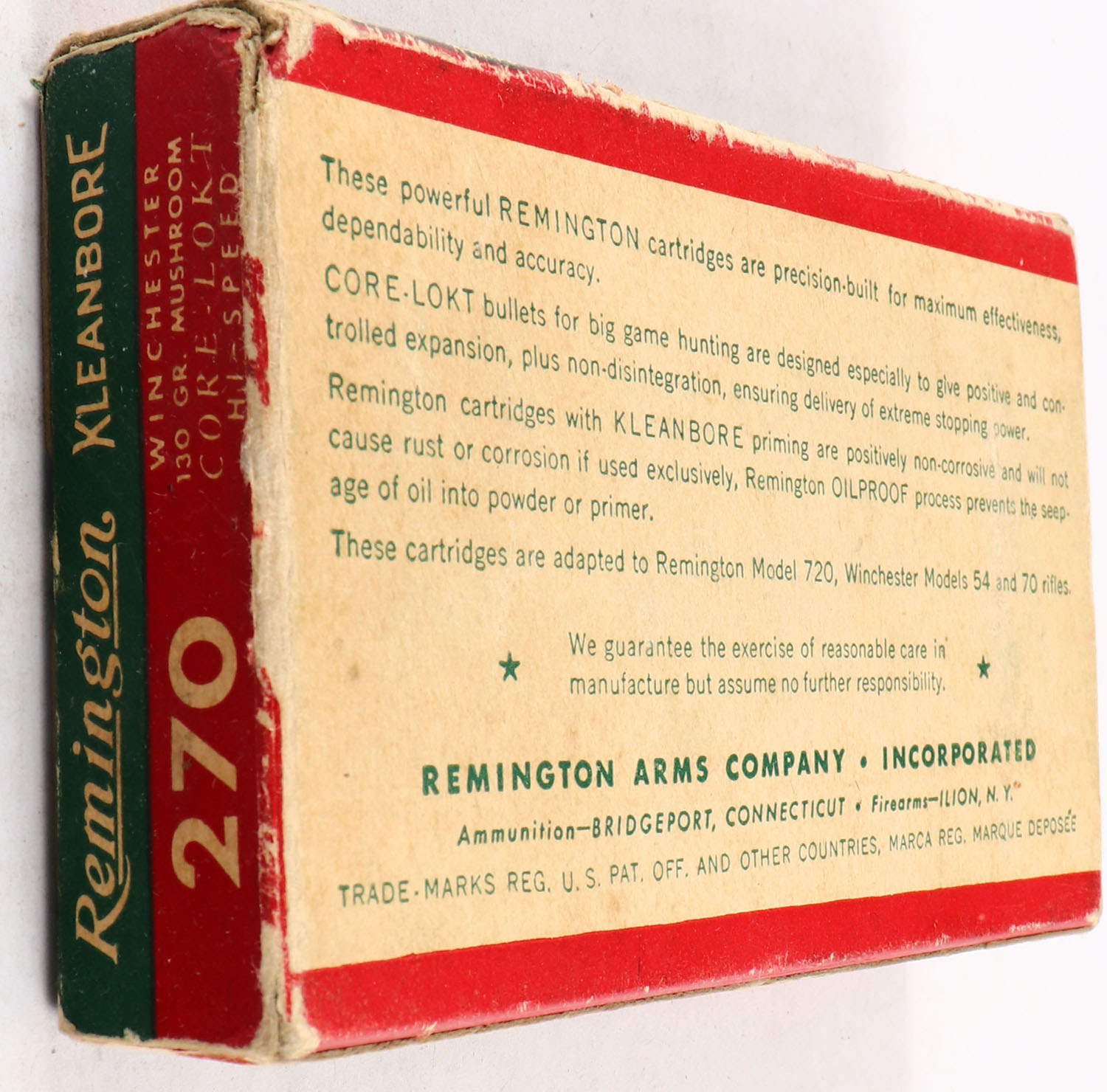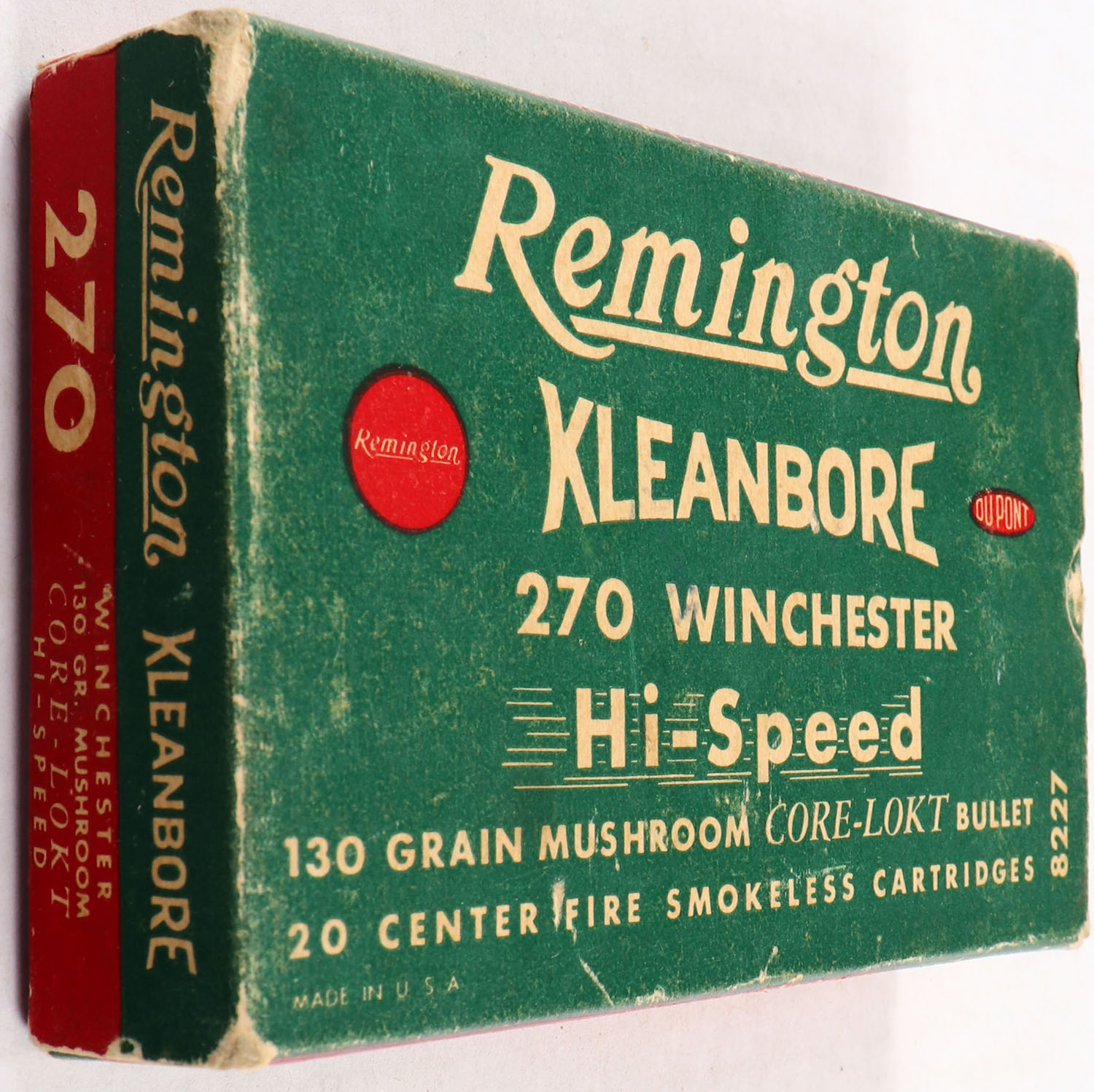 Remington, Kleanbore Hi-Speed, .270 Winchester, 130 Grain Mushroom Core-Lokt Bullet, Full, 1pc. Green white & red box, box is solid with good color, has shelf wear, edge & corner wear, end flaps are solid, ammo is good. Grade: Very Good + - Value: 10 to 40