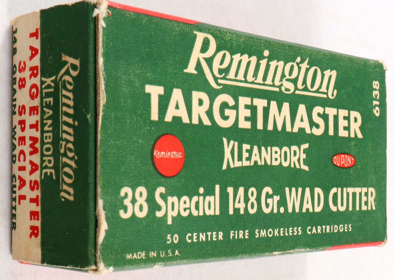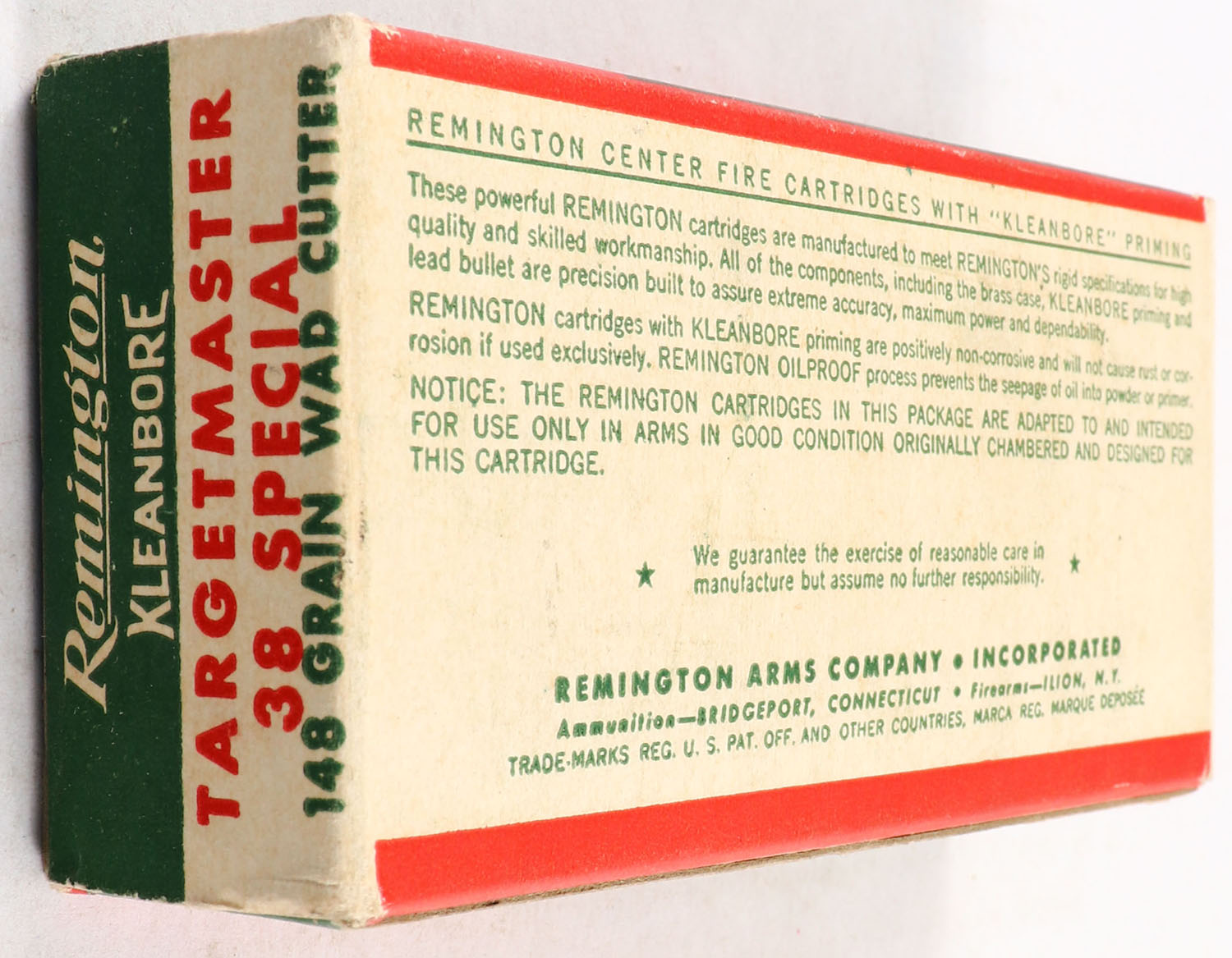 Remington, Targetmaster, .38 Special, 148 Grain Wad Cutter, Full, 1pc. Green white & red box, box is solid with very good to excellent color, minor age soiling & shelf wear, very minor corner wear, edges are mostly crisp, end flaps are solid, ammo is excellent. Grade: Excellent - Value: 20 to 40