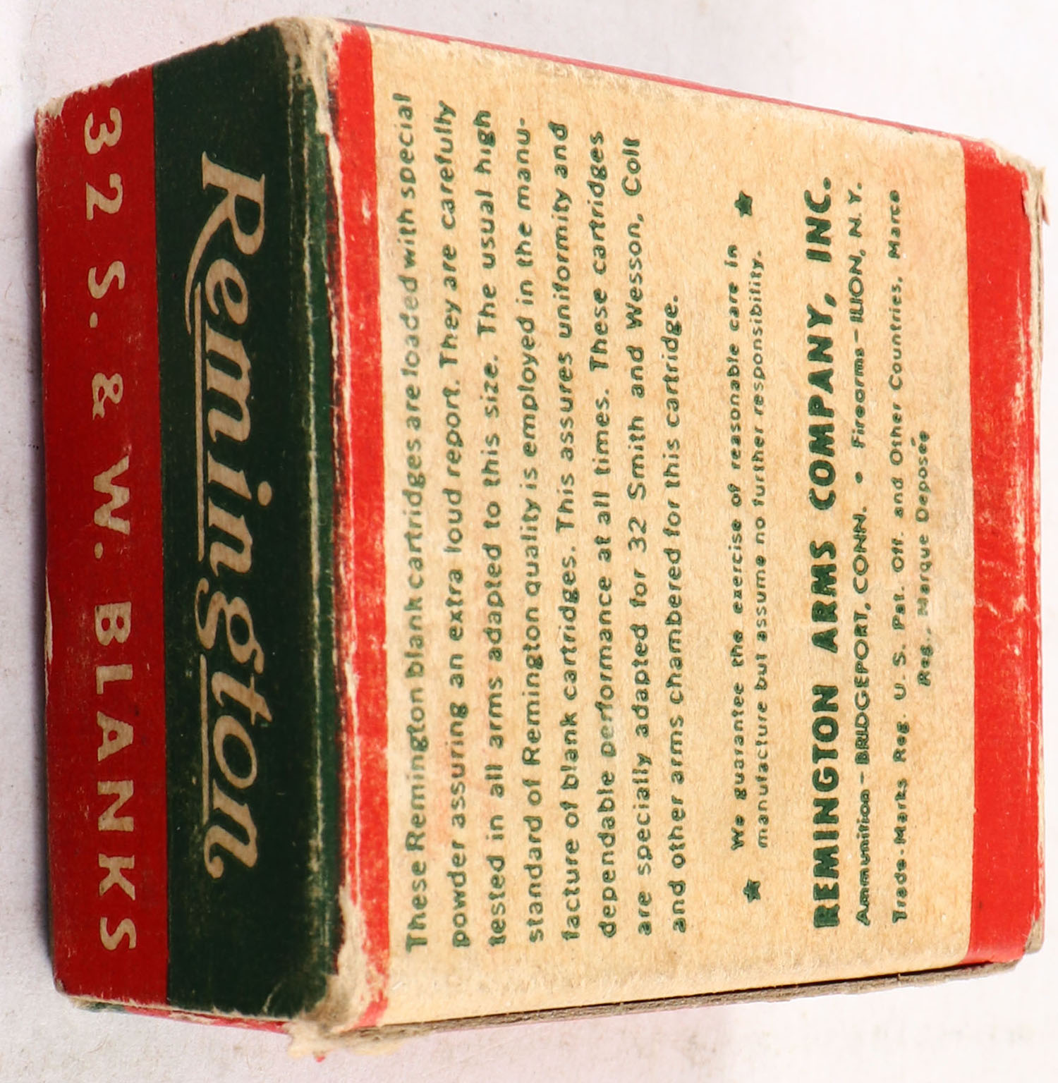 Remington, .32 Smith & Wesson Blanks, Extra Loud Report, Full, 1pc. Green red & white box, box is solid with excellent color, minor corner wear, edges are mostly crisp, end flaps are solid, ammo is excellent. Grade: Very Good ++ - Value: 8 to 30