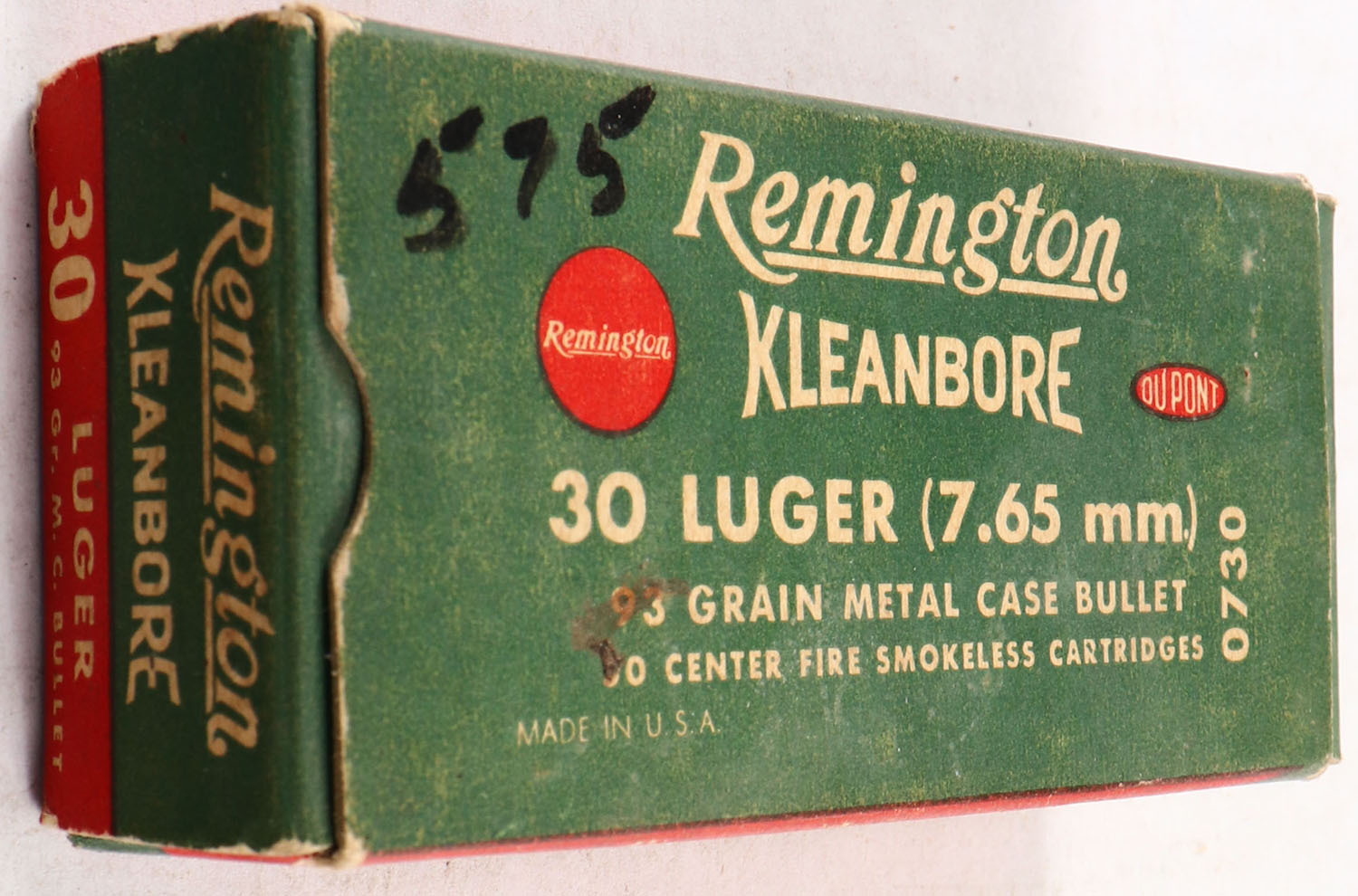 Remington, Kleanbore, .30 Luger (7.65mm), 93 Grain Metal Case Bullet, Full, 1pc. Green white & red box, box is solid with good to very good color, box has minor shelf & corner wear, edges are mostly crisp, has writing to top, end flaps are solid, ammo is excellent. Grade: Very Good ++ - Value: 30 to 90