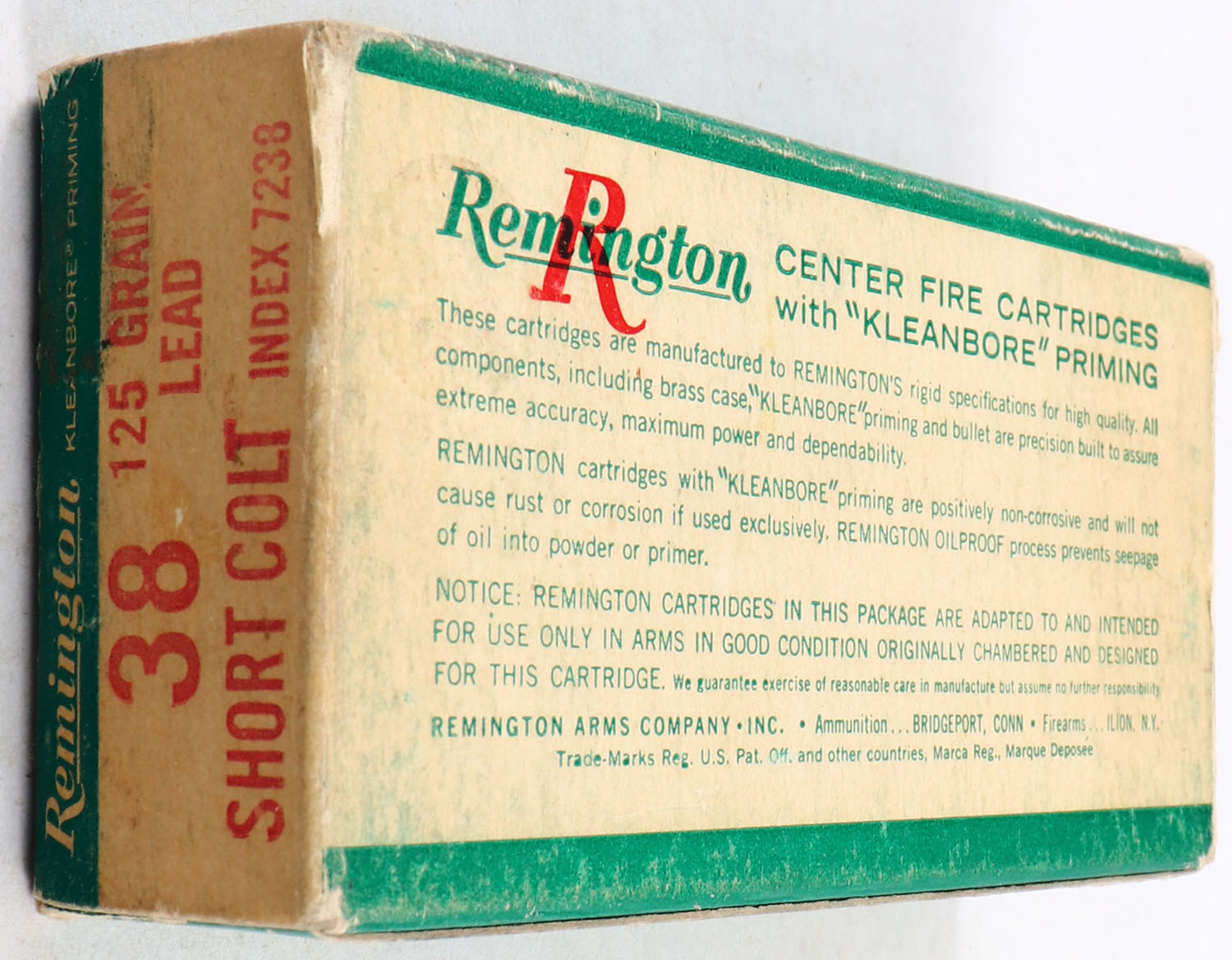Remington, .38 Short Colt, 125 Gr. Lead Bullet, 1pc, Full, Green & white box with red & white print, box is solid with rub marks, ammo is excellent. Grade: Very Good ++ - Value: 40 to 80