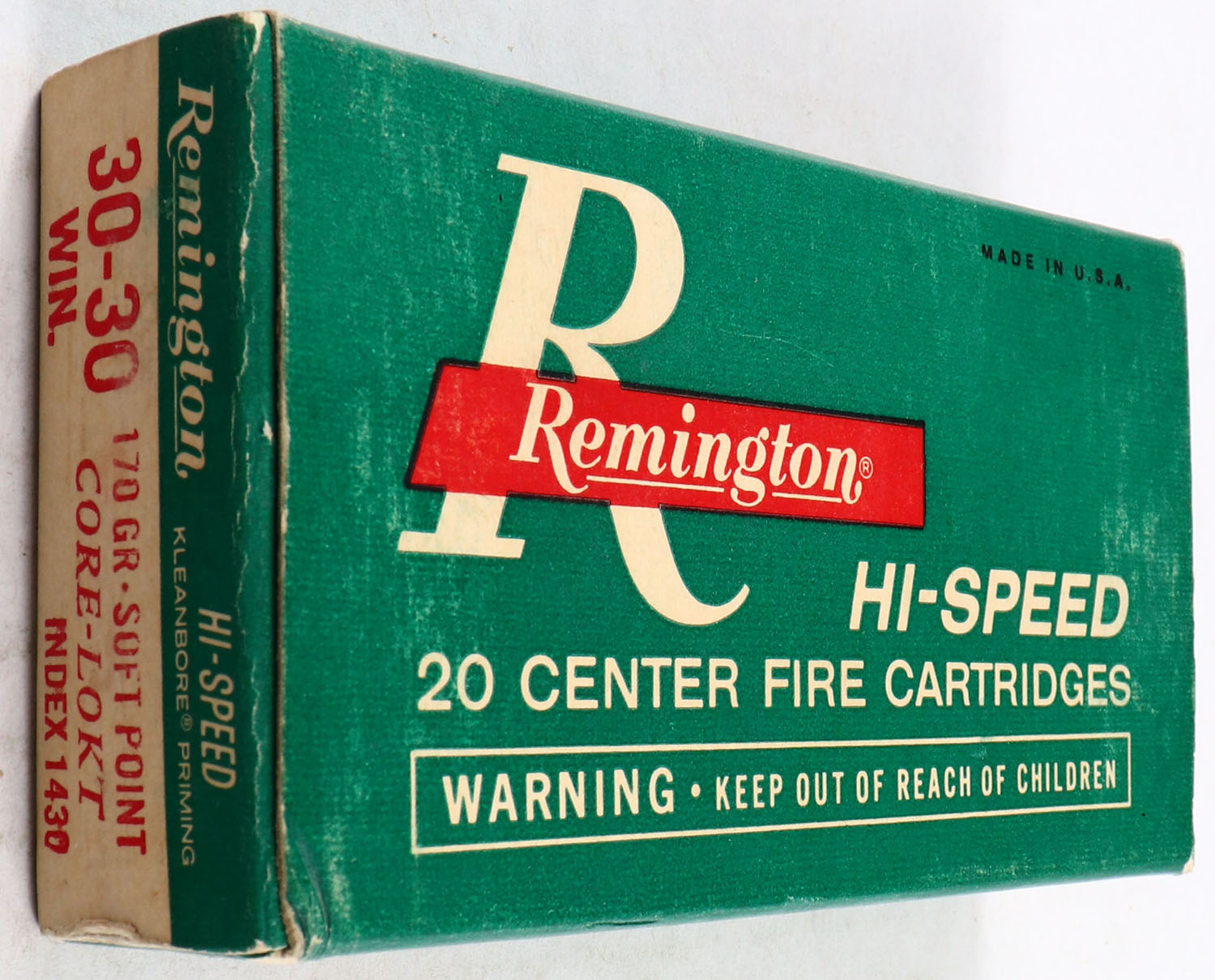 Remington, Hi-Speed, .30-30 Winchester, 170 Grain Soft Point Core-Lokt, Full, 1pc. Green white & red box, box is solid with excellent color, minor age soiling, corners are mostly sharp, edges are crisp, end flaps are solid, ammo is excellent. Grade: Excellent + - Value: 20 to 60