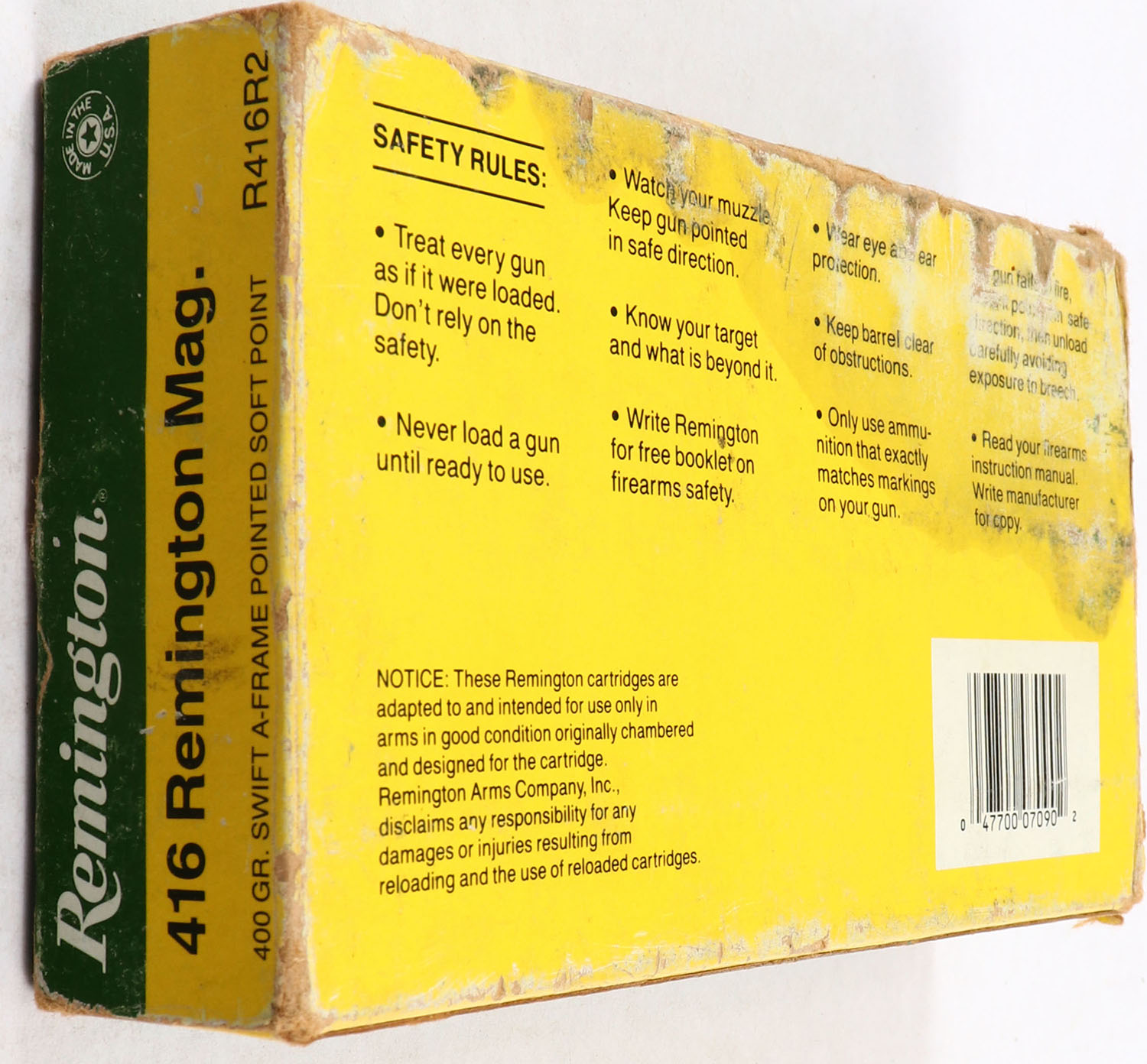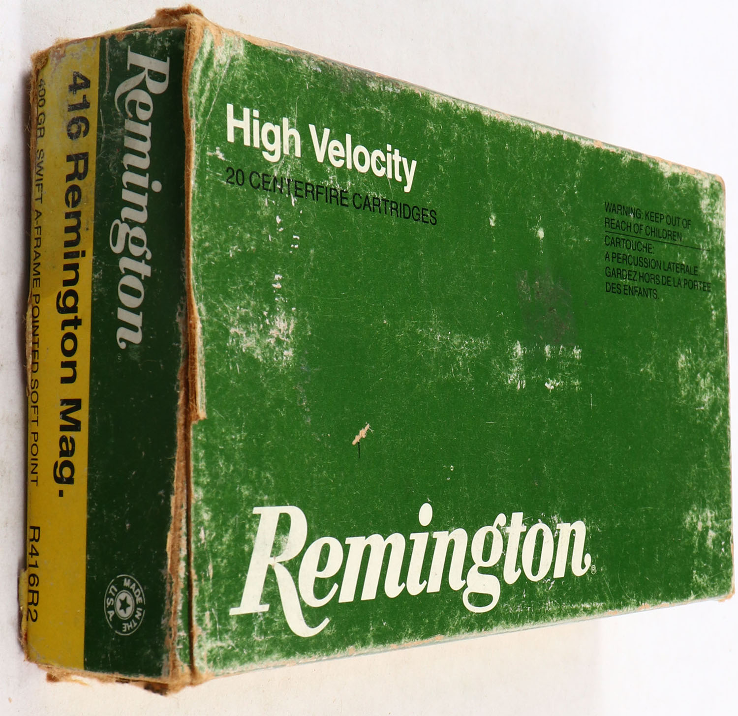 Remington, High Velocity, .416 Remington Magnum, 400 Grain Swift A-Frame Pointed Soft Point, Full, 1pc. Green yellow & white box, box is solid with some soiling, has some edge & corner wear, end flaps are solid, ammo is excellent. Grade: Very Good + - Value: 30 to 90