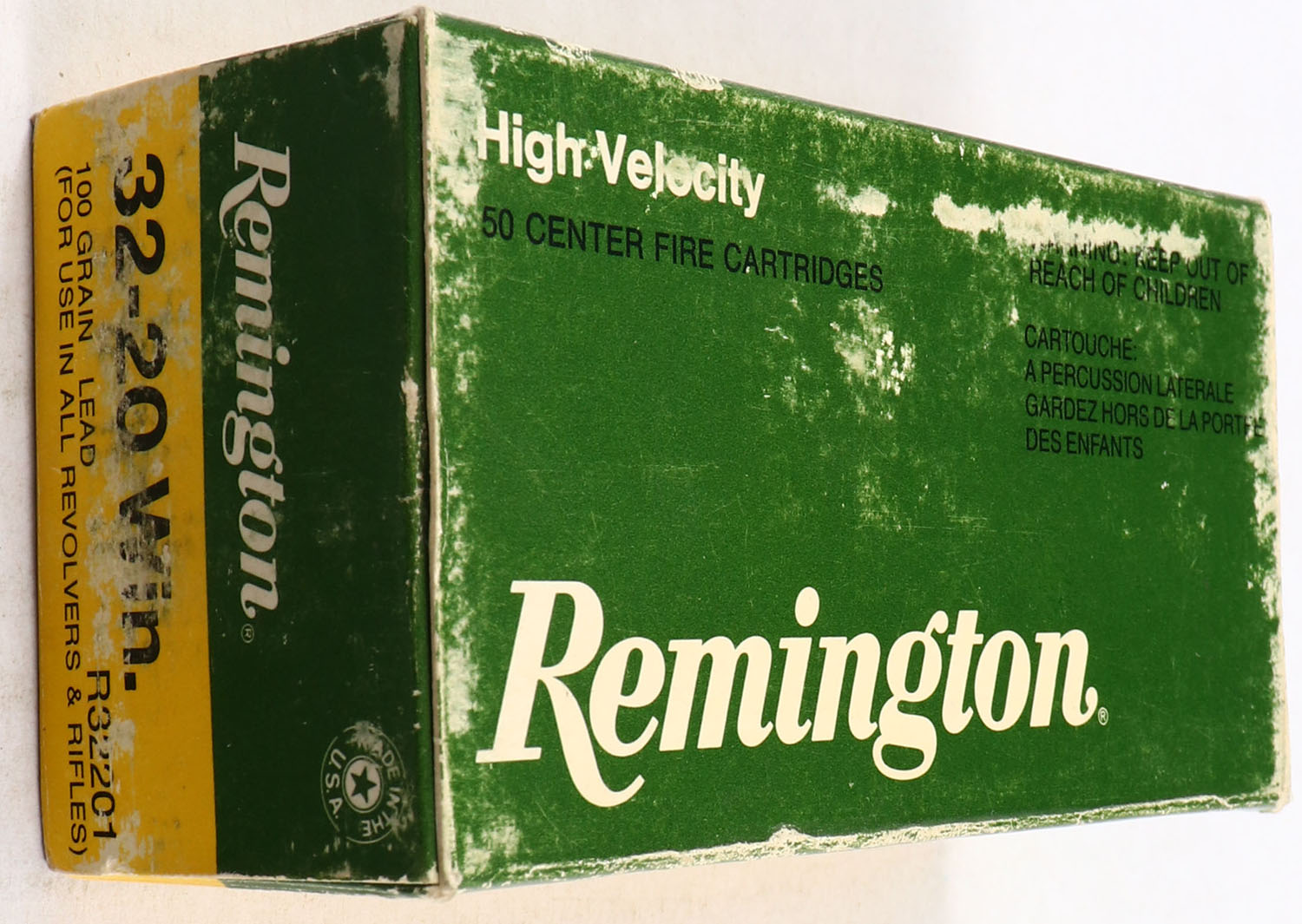 Remington, High Velocity, 32-20 Winchester, 100 Grain Lead, Full, 1pc. Green & yellow box, box is solid with good color, shelf wear, edge & corner wear, end flaps are solid, sticker on right end, ammo is excellent. Grade: Very Good ++ - Value: 50 to 150