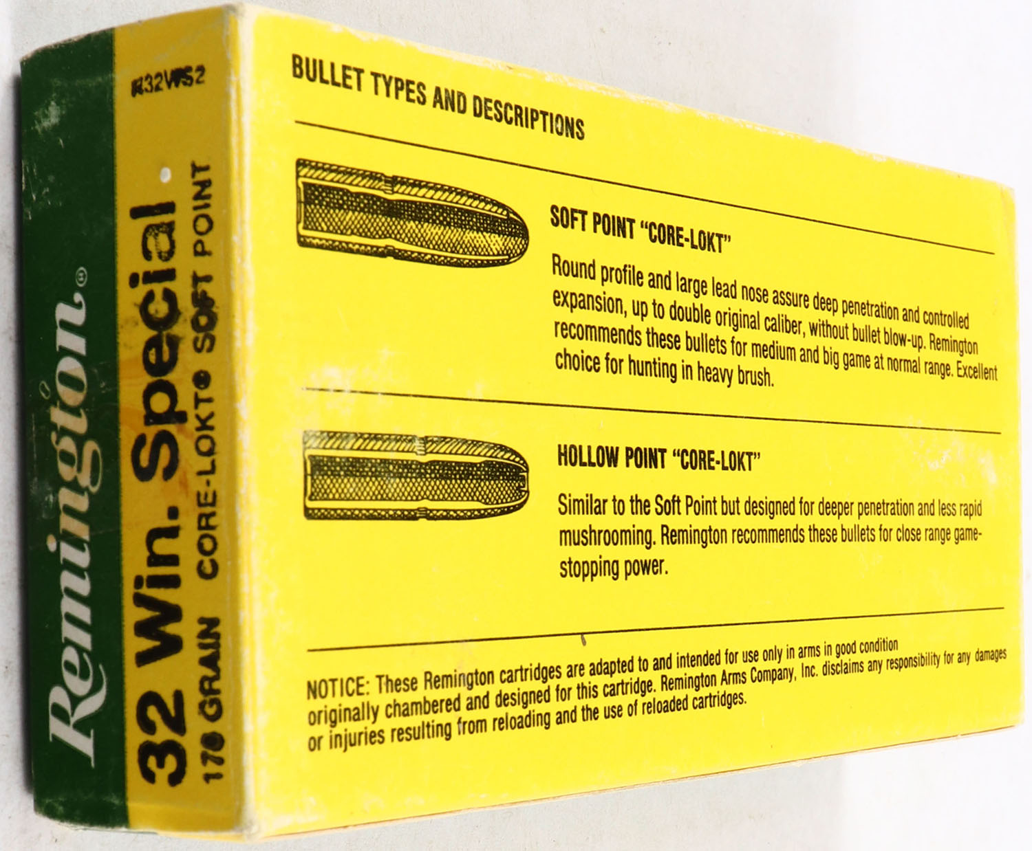 Remington, High Velocity, 32 Win Special, 170 Grain Soft Point, Full, 1pc. Yellow, green, white & black box, box is solid with great color, box has age soiling & light scuffing, end flaps are solid, ammo is excellent. Grade: Excellent - Value: 10 to 50