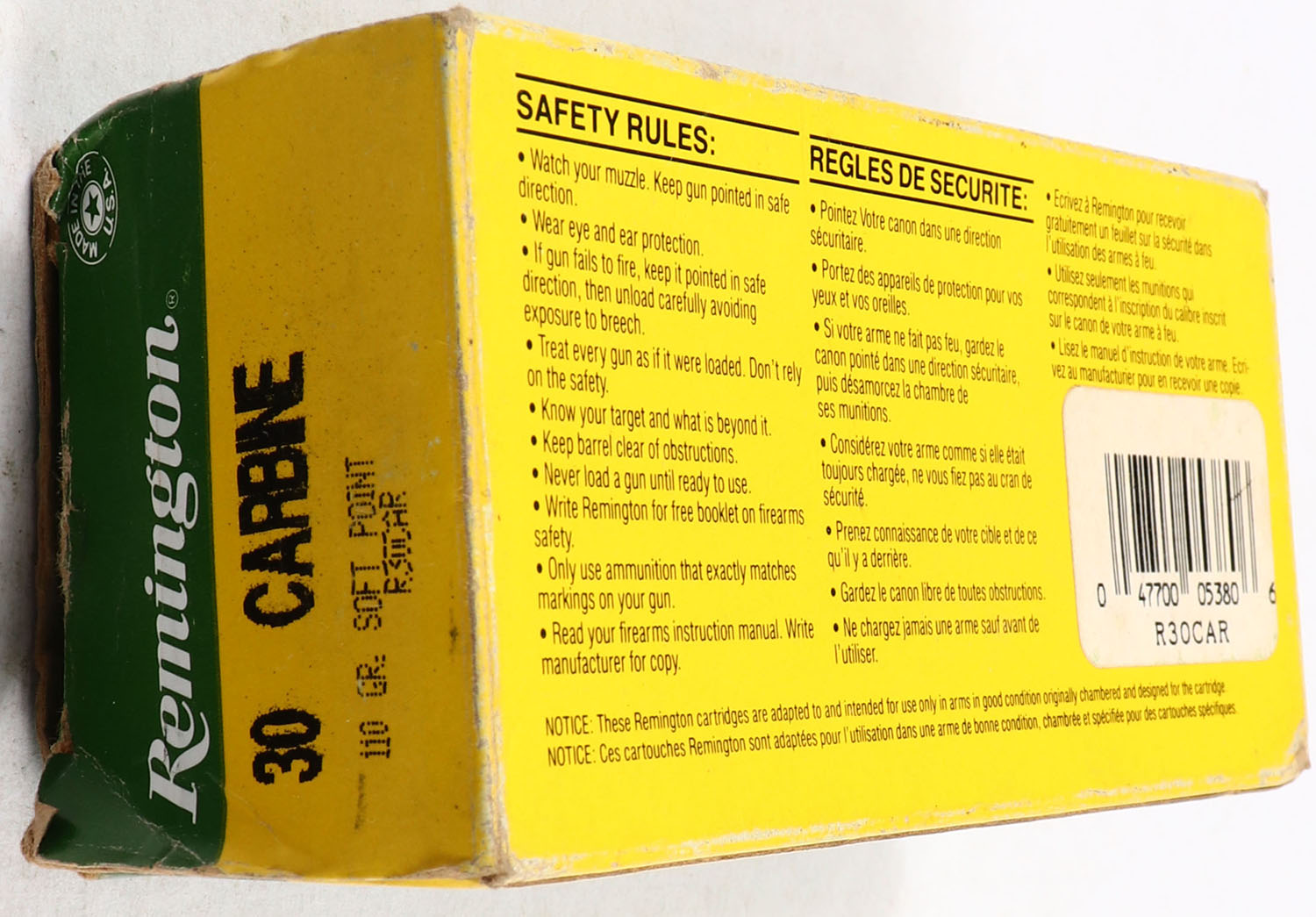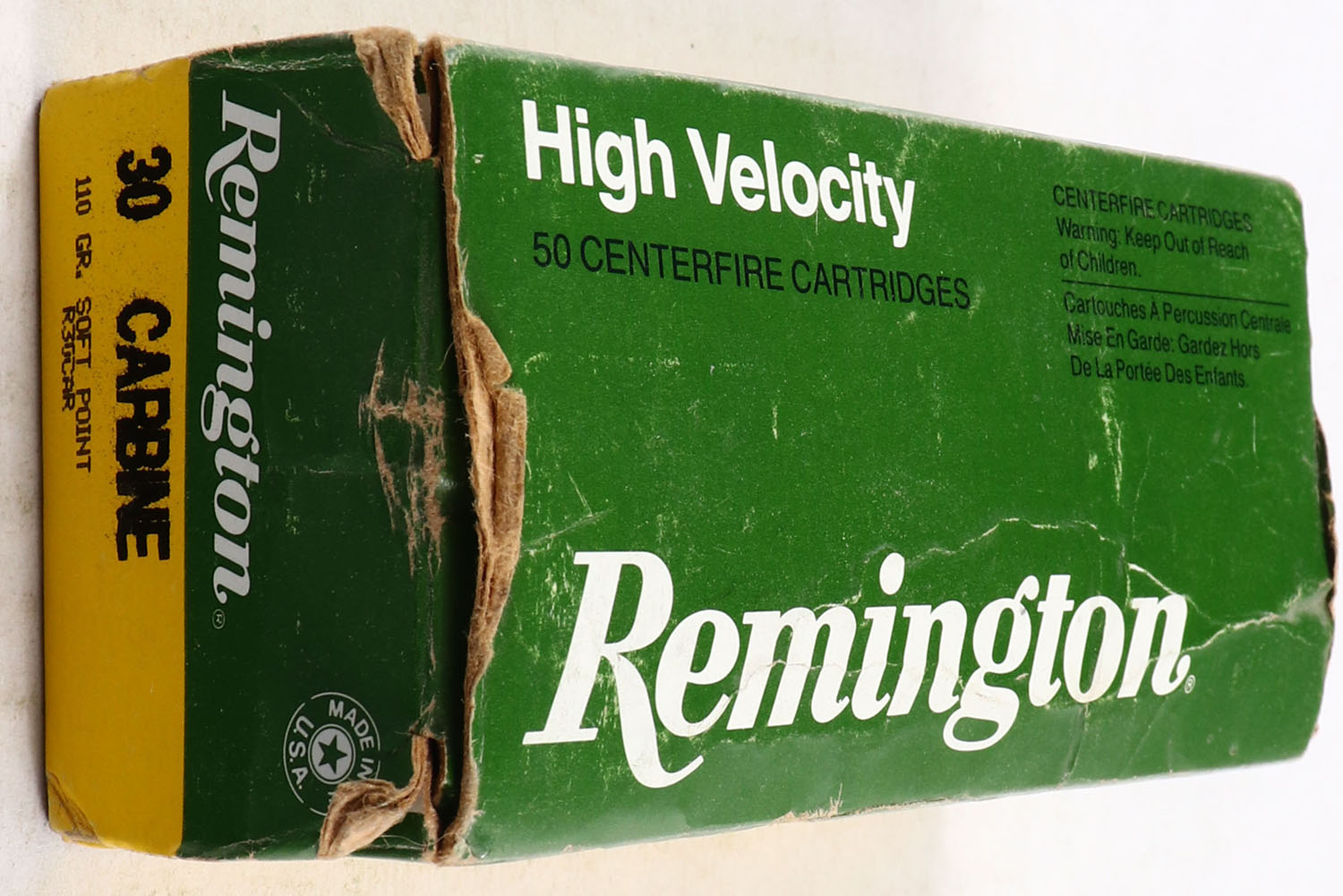 Remington, High Velocity, 30 Carbine, 110 Grain Soft Point, Full, 1pc. Yellow, green, white & black box, box is solid with good color, shelf wear, edge & corner wear, end flaps are solid, ammo is excellent. Grade: Very Good + - Value: 10 to 50