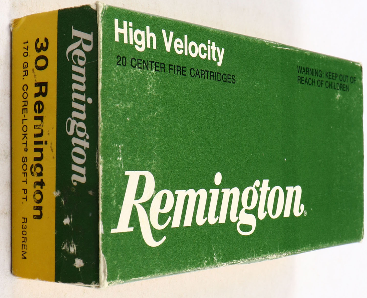 Remington, High Velocity, .30 Remington, 170 Gr. Soft Point Core-Lokt Bullet, 1pc, Full, green/yellow box with white/black print, box is solid with rub marks, ammo is excellent. Grade: Excellent - Value: 30 to 60