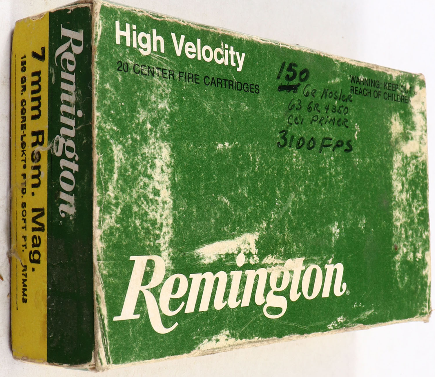 Remington, High Velocity, 7mm Rem Mag, 150 Grain Core-Lokt Pointed Soft Point, Full, 1pc. Yellow, green, white & black box, box has soiling, shelf wear, edge & corner wear, end flaps are solid, ammo is very good. Grade: Good ++ - Value: 10 to 50