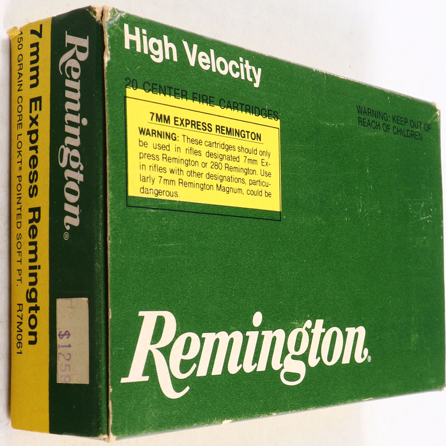 Remington, High Velocity, 7mm Express Remington, 150 Gr. Core-Lokt Pointed Soft P.T. bullet, 1pc, Full, green/yellow box with white/black print, box is solid with minor rub marks & minor corner wear, ammo is very good. Grade: Excellent - Value: 30 to 60