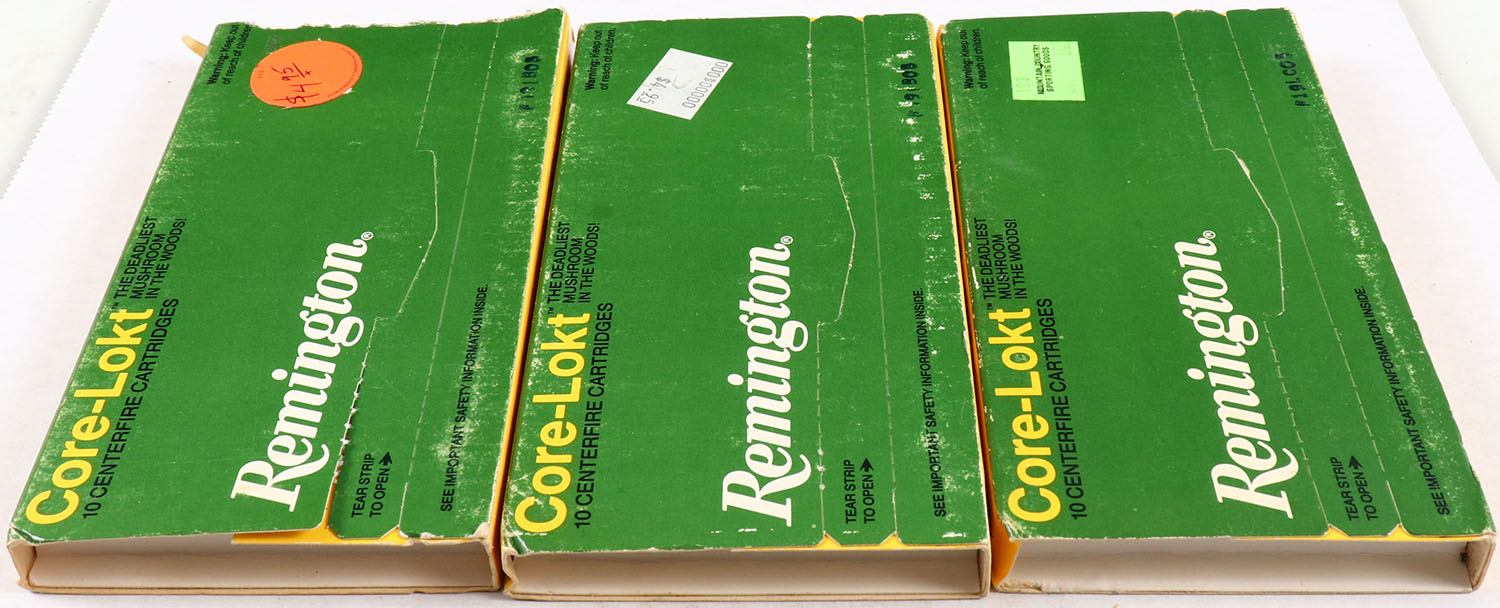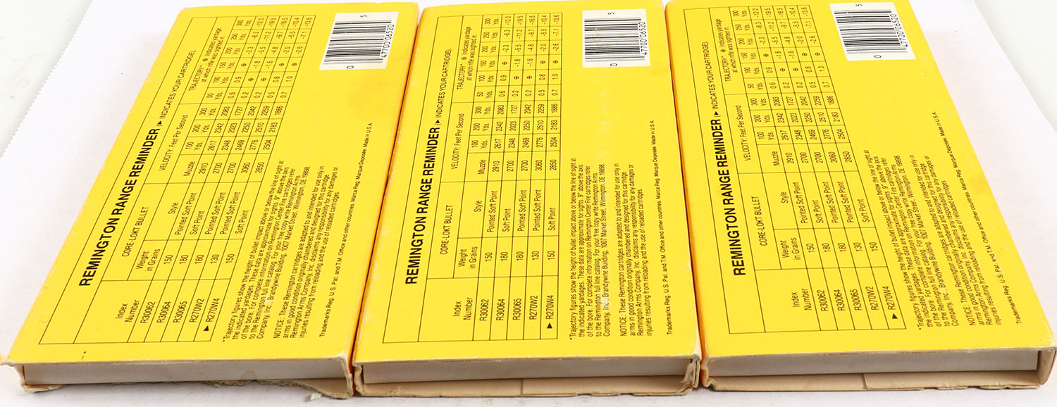 Remington, Lot of 3, Core-Lokt, 270 Win, 150 Grain SP, FULL & SEALED, 1pc. Yellow, green, white & black box, boxes are very solid. Grade: Very Good ++ - Value: 10 to 40