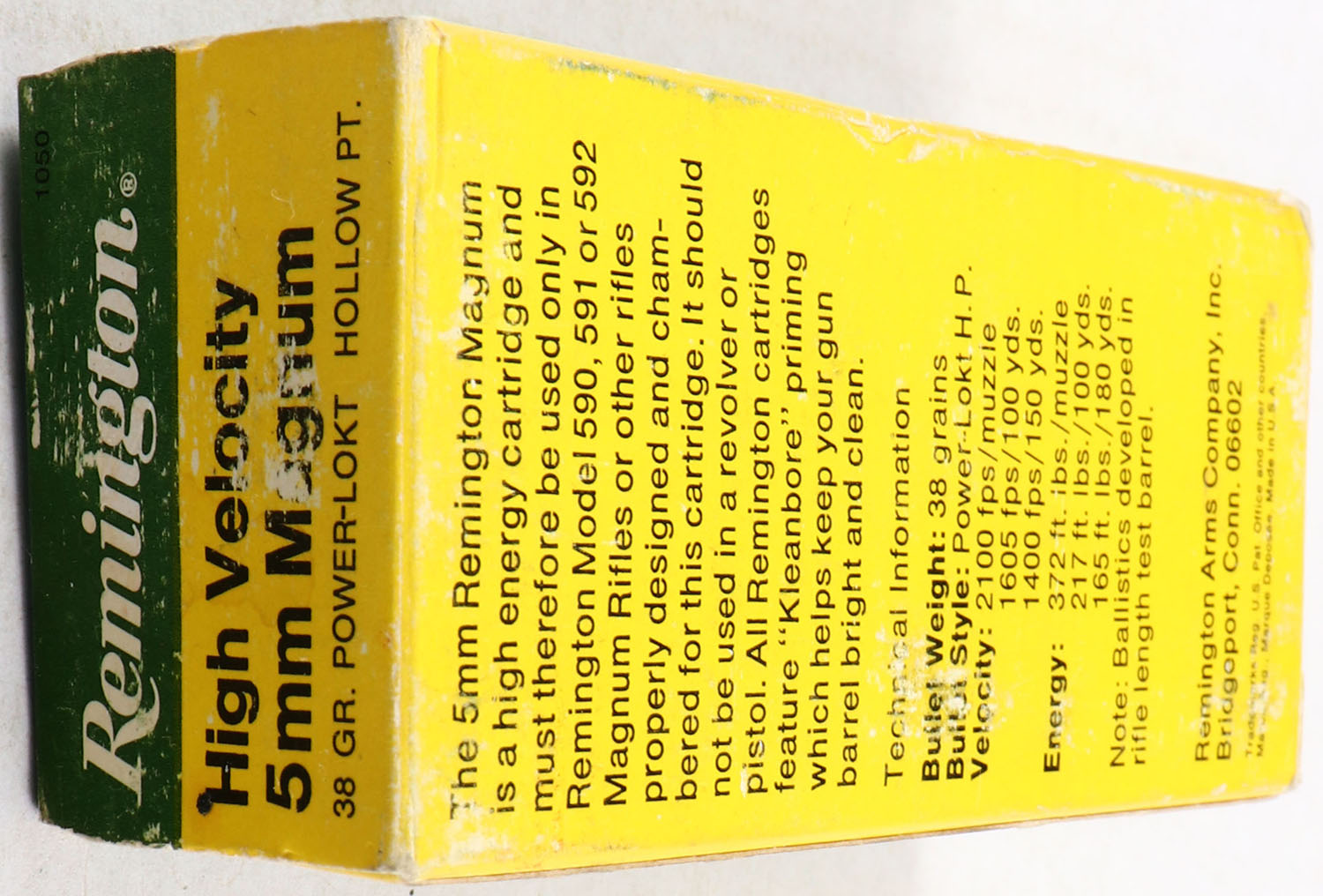 Remington, High Velocity, 5mm Magnum, 38 GR. Power-Lokt Hollow PT. Full, 1pc. Green, yellow & white box, box is solid with rub marks, minor edge & corner wear, has an extra Rd. taped on box, end flaps are solid, ammo is excellent. Grade: Excellent - Value: 30 to 60