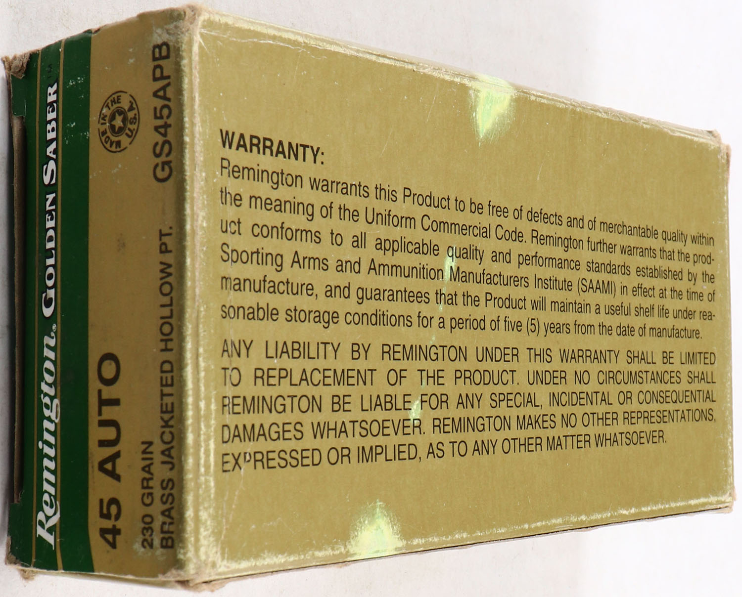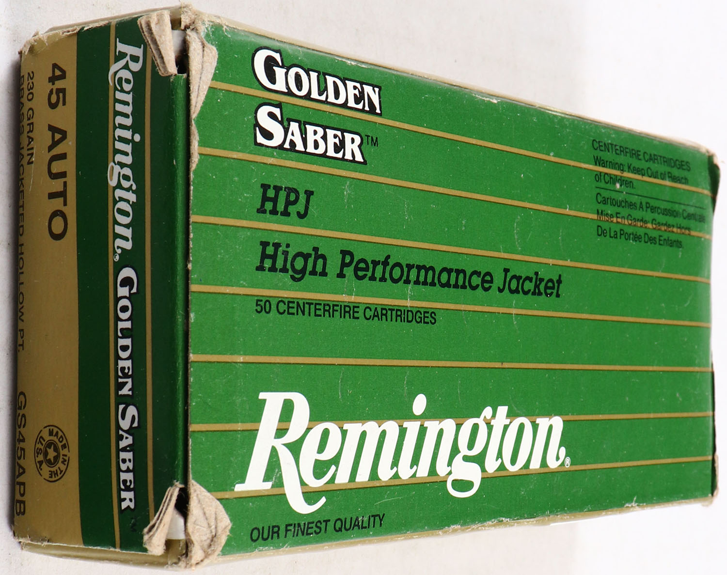 Remington, Golden Saber, 45 Auto, 230 Gr. Brass Jacketed Hollow PT., Full, multi-colored box, box is solid, has corner wear, ammo is excellent. Grade: Very Good ++ - Value: 20 to 60