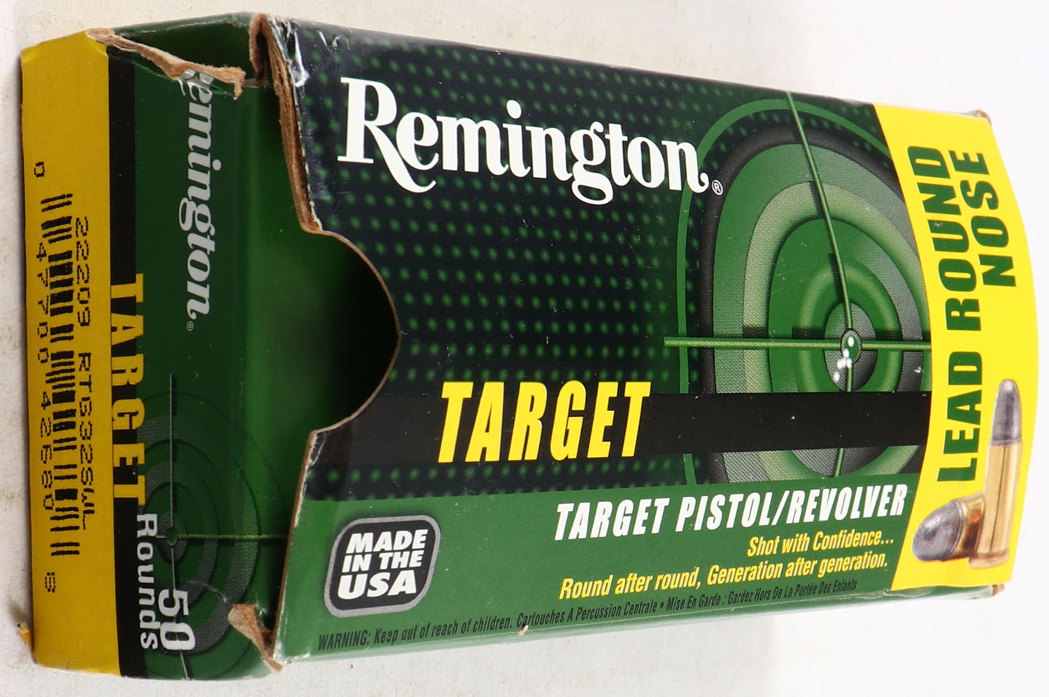 Remington Target, 32 S&W Long, 98 Grain, Lead Round Nose, Full, 1pc. Yellow, green & black box, box is solid with great color, minor edge & corner wear, end flaps are solid, ammo is excellent. Grade: Excellent + - Value: 20 to 80