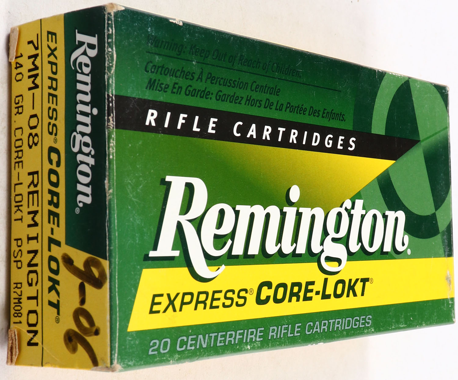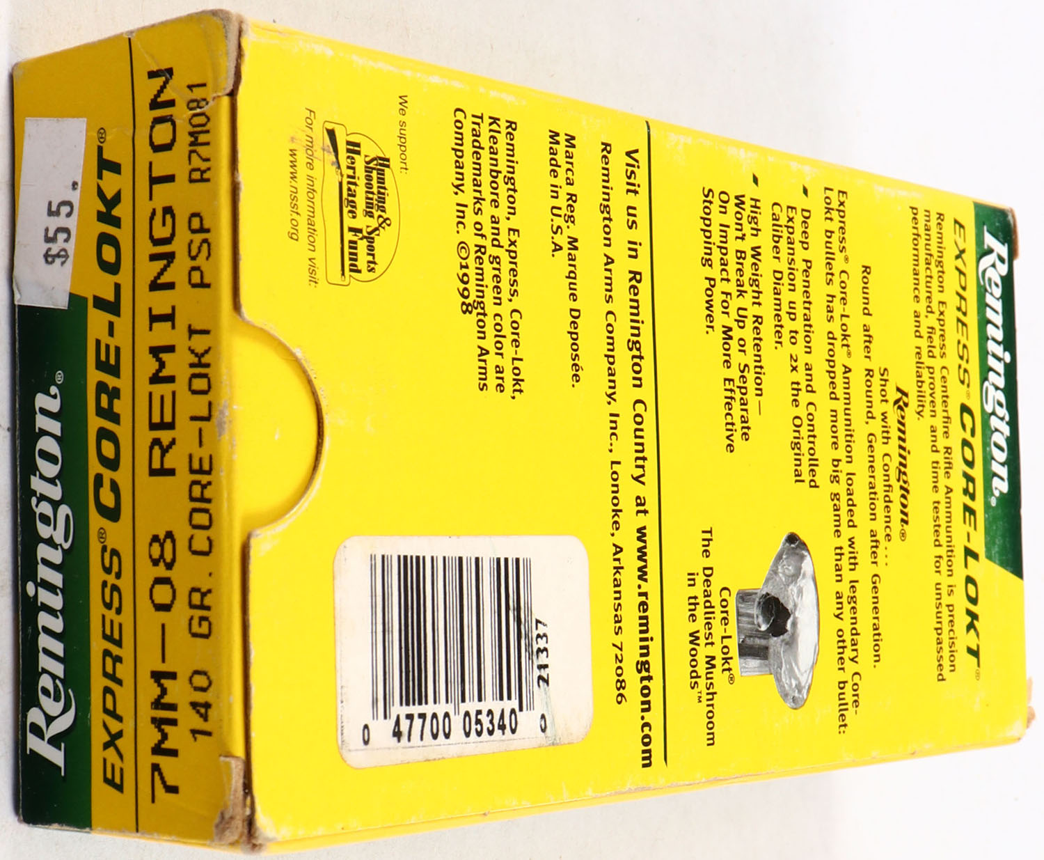 Remington, Express Core-Lokt, 7mm-08 REM., 140 Gr. Core-Lokt PSP Bullet, 1pc. Full, Green & yellow box with white & black print, box is solid with light shelf wear, ammo is excellent. Grade: Excellent - Value: 20 to 60