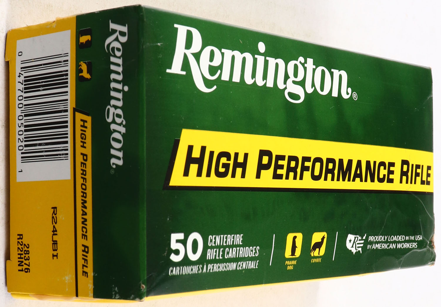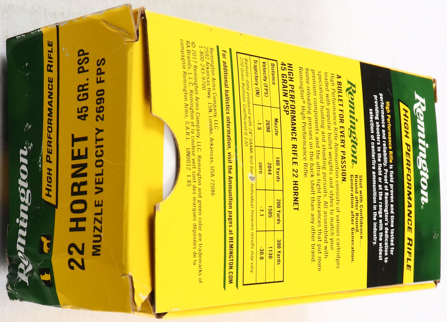 Remington, High Performance Rifle, 22 Hornet, 45 Grain, Pointed Soft Point, Full, 1pc, Green & yellow box, box is solid with good color, rub wear, ammo is excellent. Grade: Very Good ++ - Value: 50 to 100