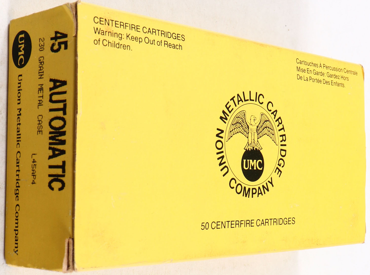 Remington, .45 Automatic, 230 Gr Metal Case, 1pc, Full, yellow box with black print, box is solid with sticker on bottom & light corner wear, ammo is excellent. Grade: Excellent + - Value: 30 to 90