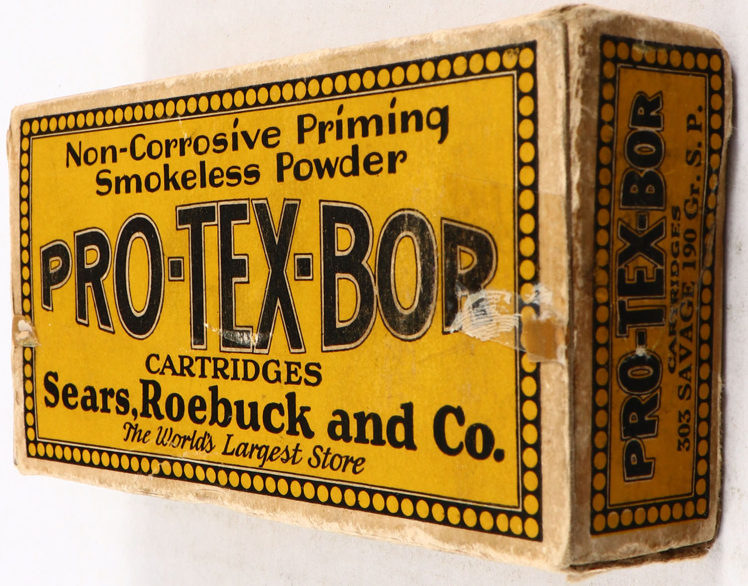 Sears, Pro-Tex-Bor, 303 Savage, 190 Gr. Soft Point, Full of Mixed H.S., 1pc. Yellow black & buff box, box has tape repairs to torn ends, light age soiling, has some edge & corner wear, ammo is good. Grade: Very Good - Value: 40 to 200