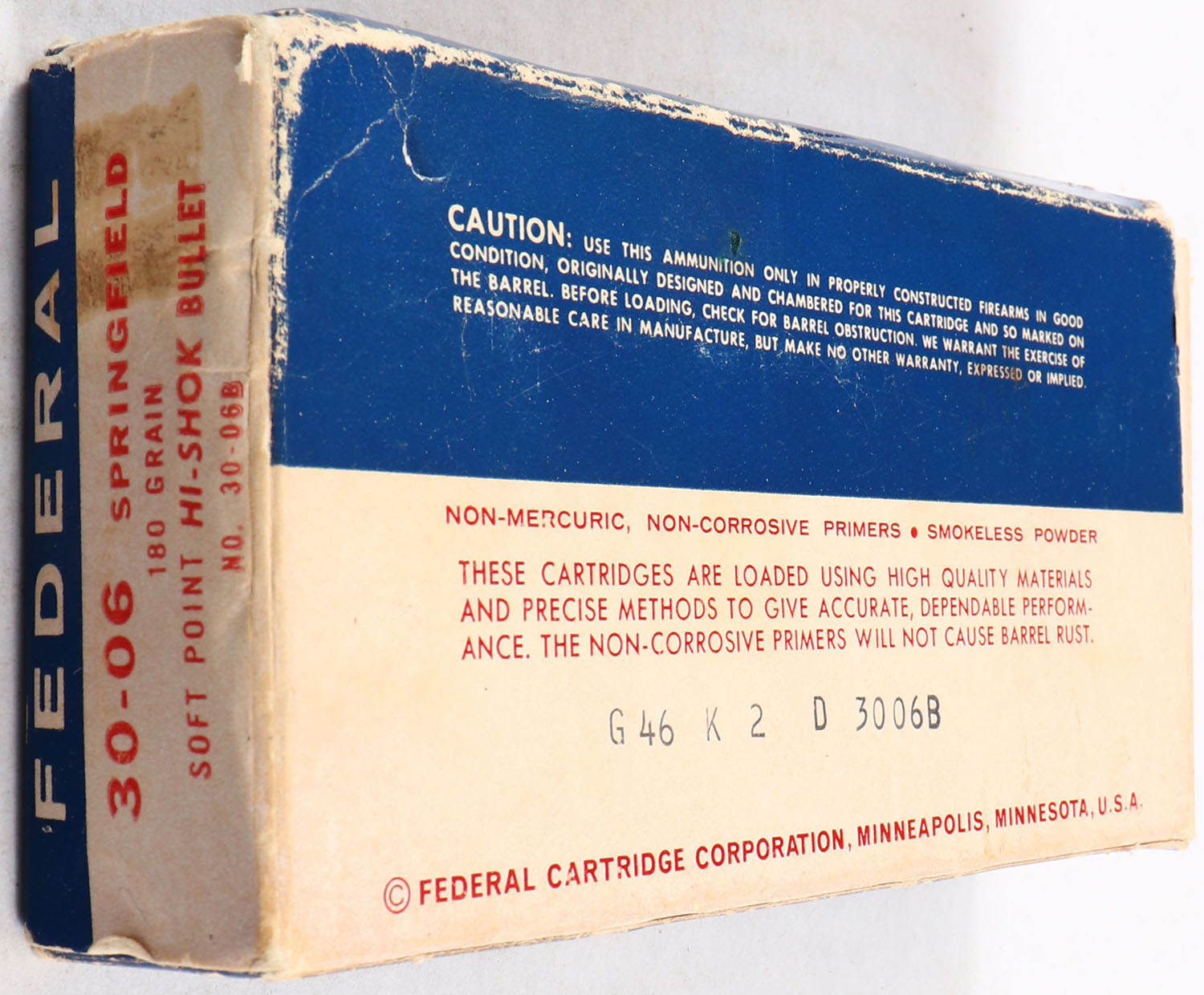 Federal, 30-06 Springfield, 180 Gr. S.P. Hi-Shok Bullet, 1 pc., Full, box shows wear, ammo is very good. Grade: Very Good - Value: 10 to 40