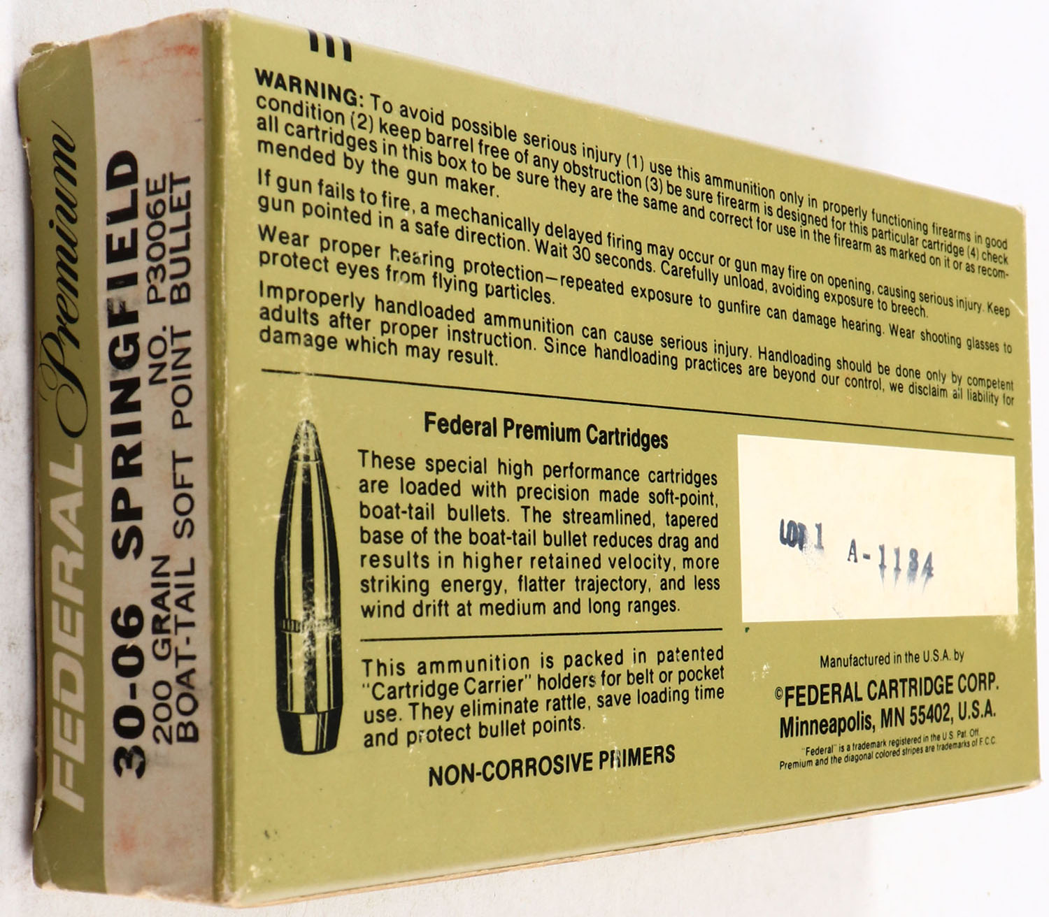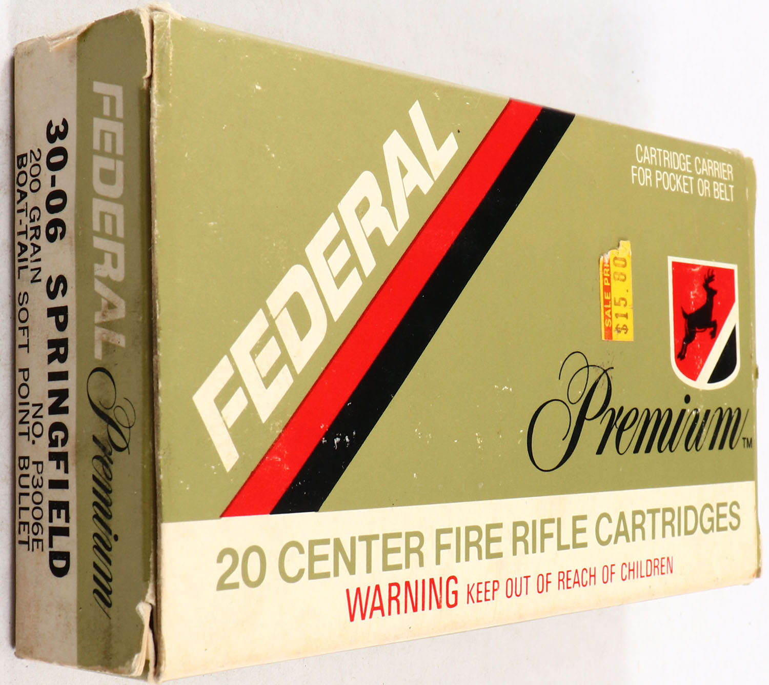 Federal, Premium, 30-06 SPRG., 200 Grain Boat-Tail SP, Full, 1pc. multi-colored box, box is solid with excellent color, ammo is excellent. Grade: Excellent - Value: 20 to 40
