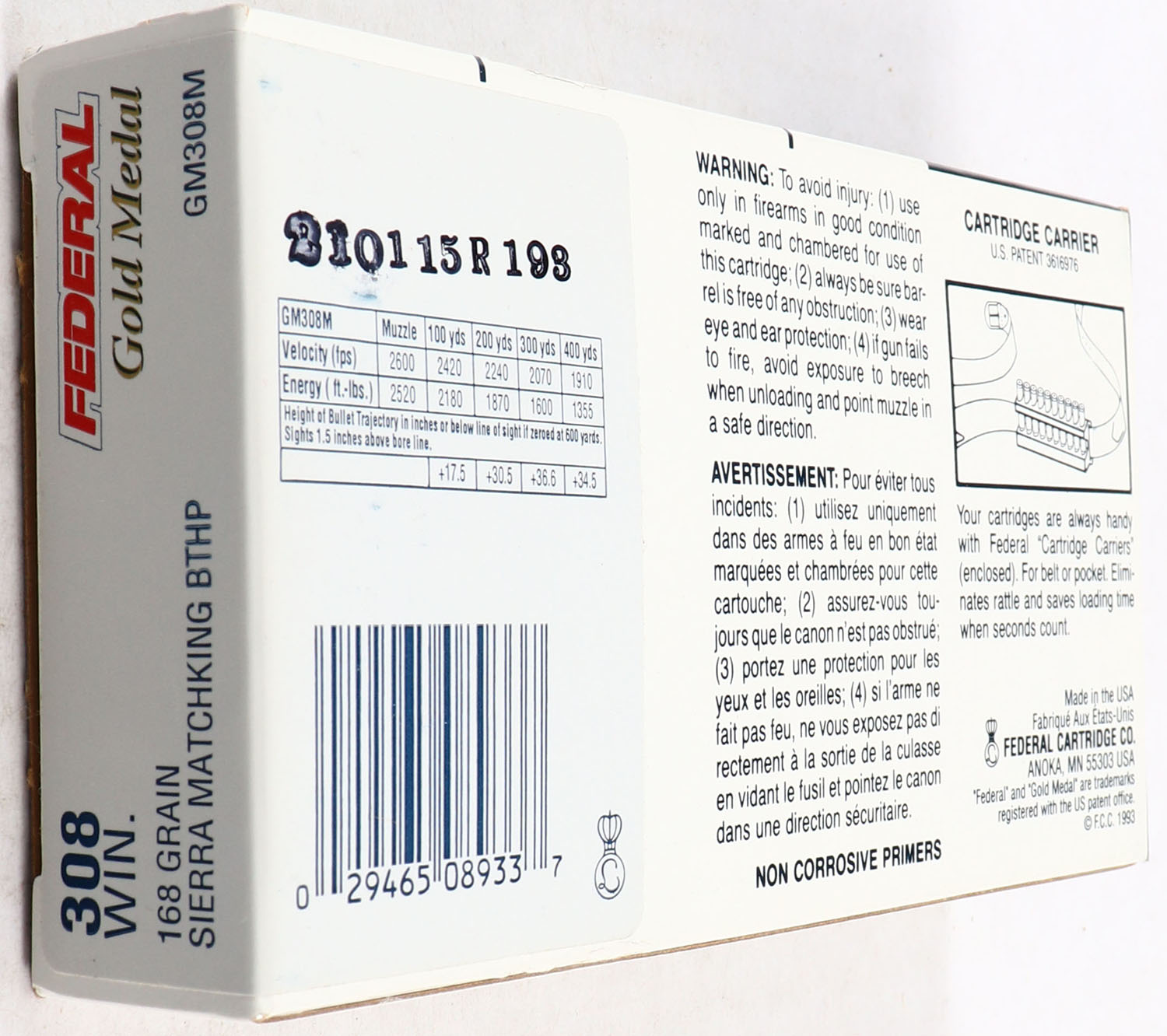 Federal, Gold Medal, 308 Winchester, 168 Grain, Sierra Matching BTHP, Full, 1pc. Box is solid with great color, blue & white box, minor edge & corner wear, end flaps are solid, ammo is excellent. Grade: Excellent + - Value: 20 to 80