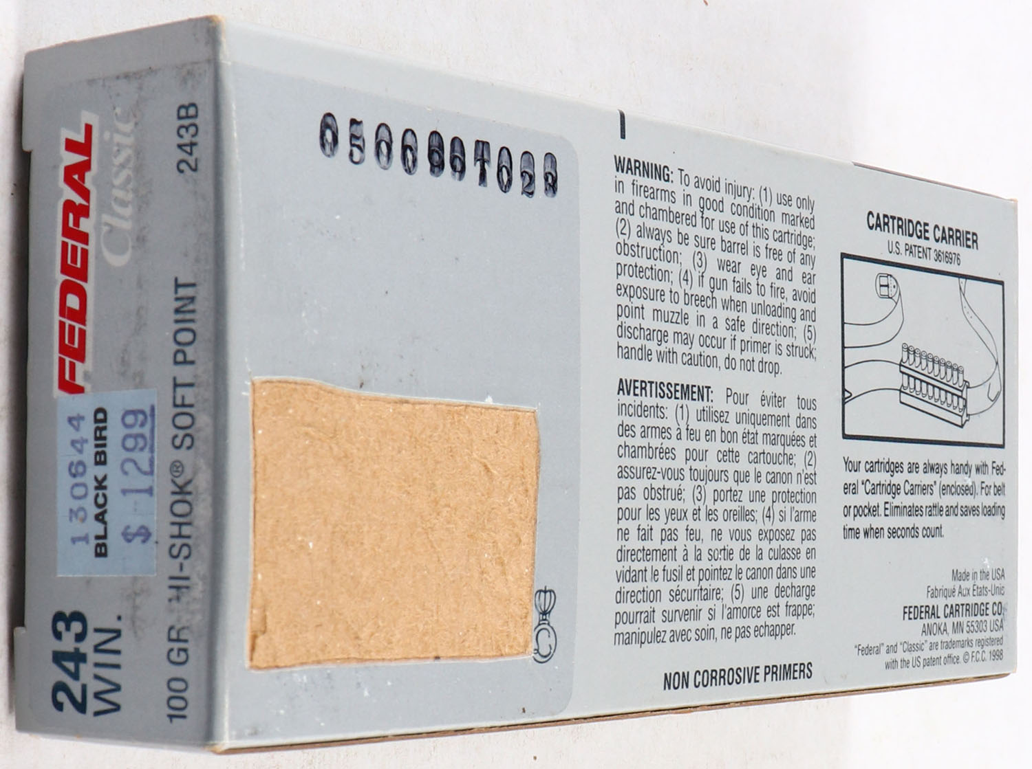 Federal, Classic, 243 WIN., 100 Gr. Hi-Shok Soft Point, Full, 1pc. Multi-colored box, box is solid with great color, end flaps are solid, ammo is minty. Grade: Excellent ++ - Value: 10 to 40