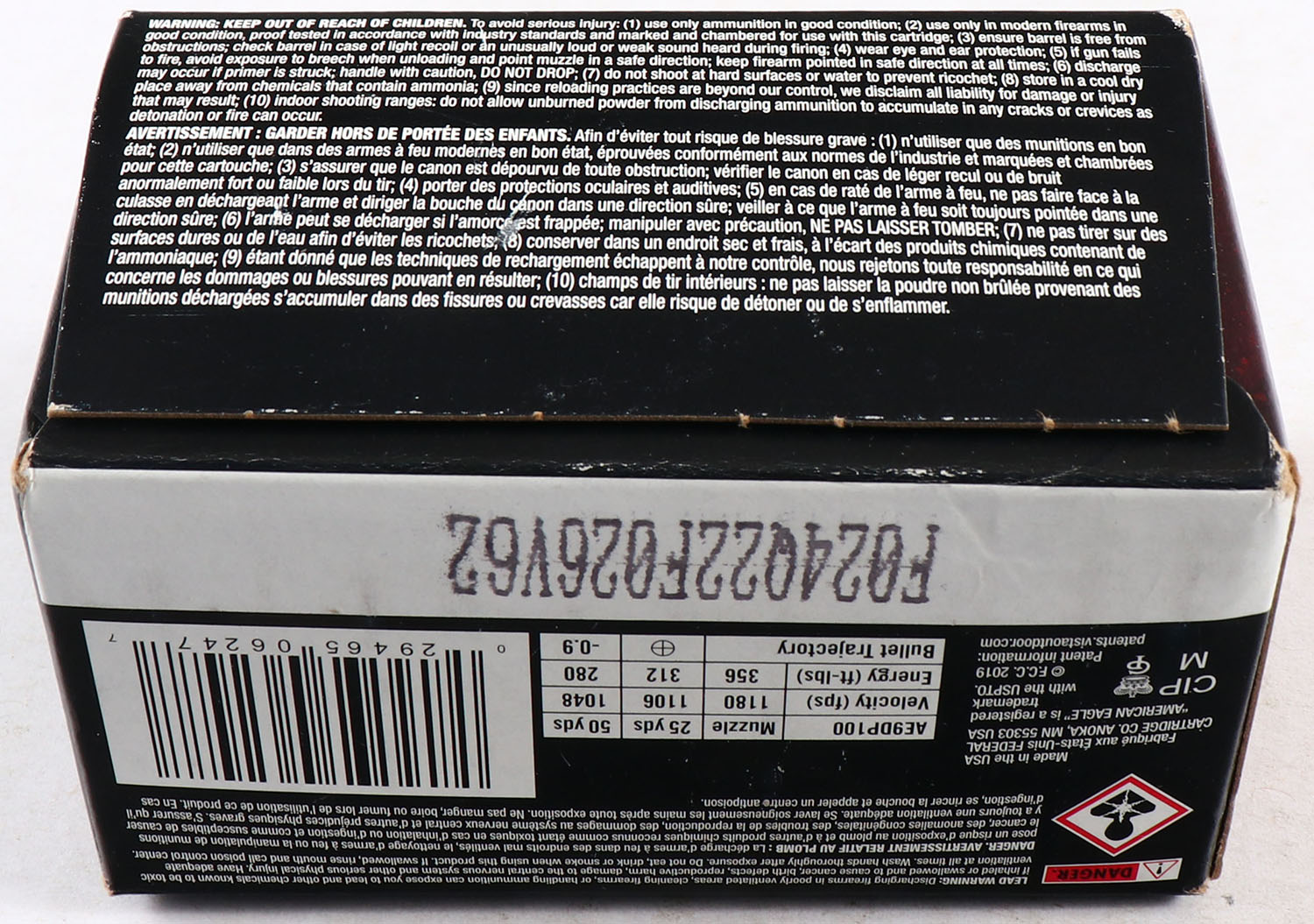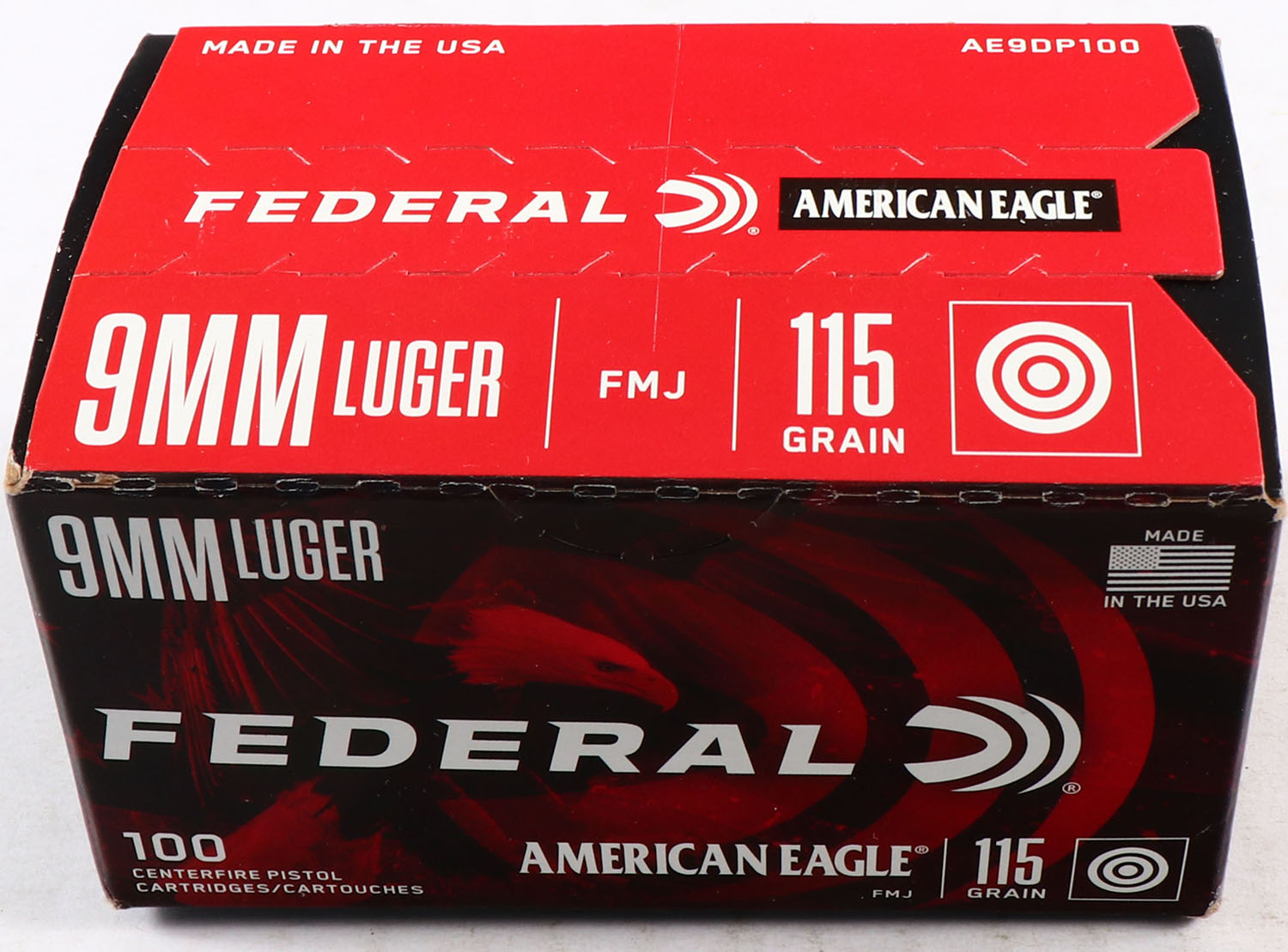 Federal, American Eagle, 9mm Luger, 115 Grain FMJ, FULL & SEALED, 1pc., multi-colored box, box is solid with great color, end flaps are solid. Grade: Excellent ++ - Value: 10 to 50