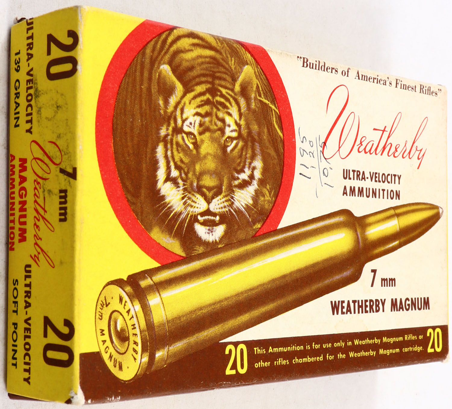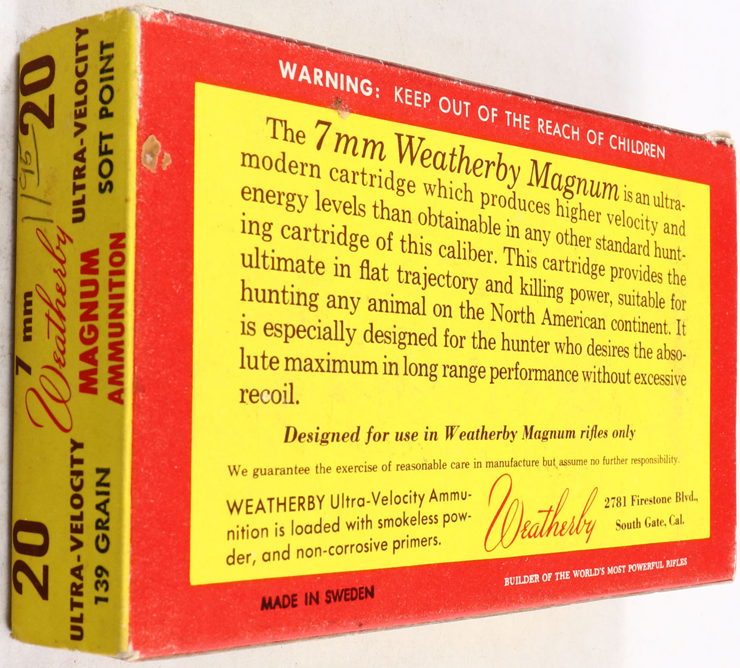 Weatherby, 7mm W.M., 139 Grain Ultra Velocity Soft Point, Full, 1pc., multi-colored box, box is solid with very good color, very light shelf wear, end flaps are solid, ammo is excellent. Grade: Excellent - Value: 20 to 80