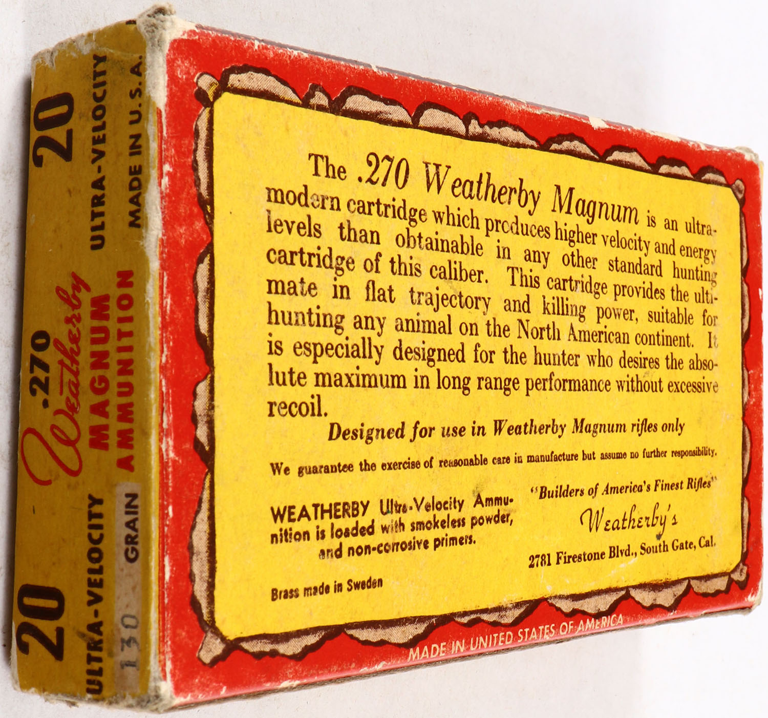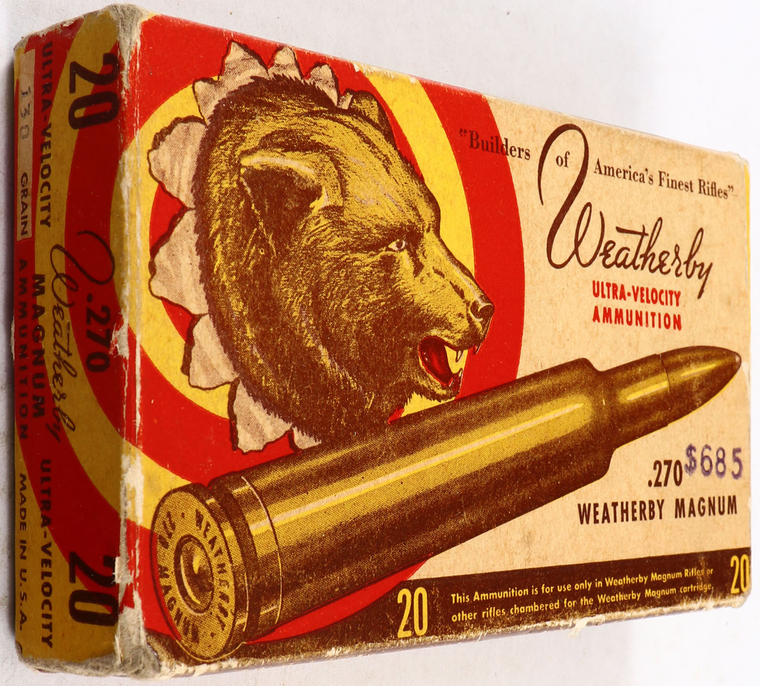 Weatherby, 270 W.M., 130 Grain Ultra Velocity, Full, 1pc. multi-colored box, box has shelf & corner wear, box is solid with good color, Ammo is very good. Grade: Very Good ++ - Value: 20 to 80