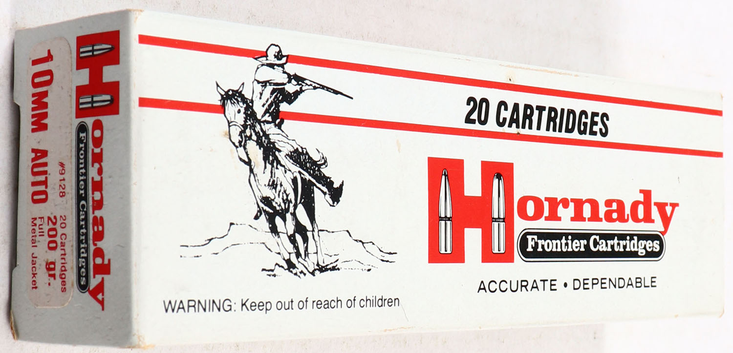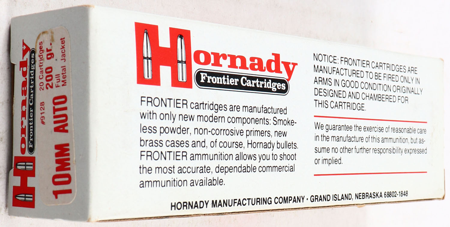 Hornady, Frontier, 10mm Auto, 200 Grain FMJ, Full, 1pc. multi-colored box, box is solid with excellent color, Ammo is excellent. Grade: Excellent ++ - Value: 10 to 40