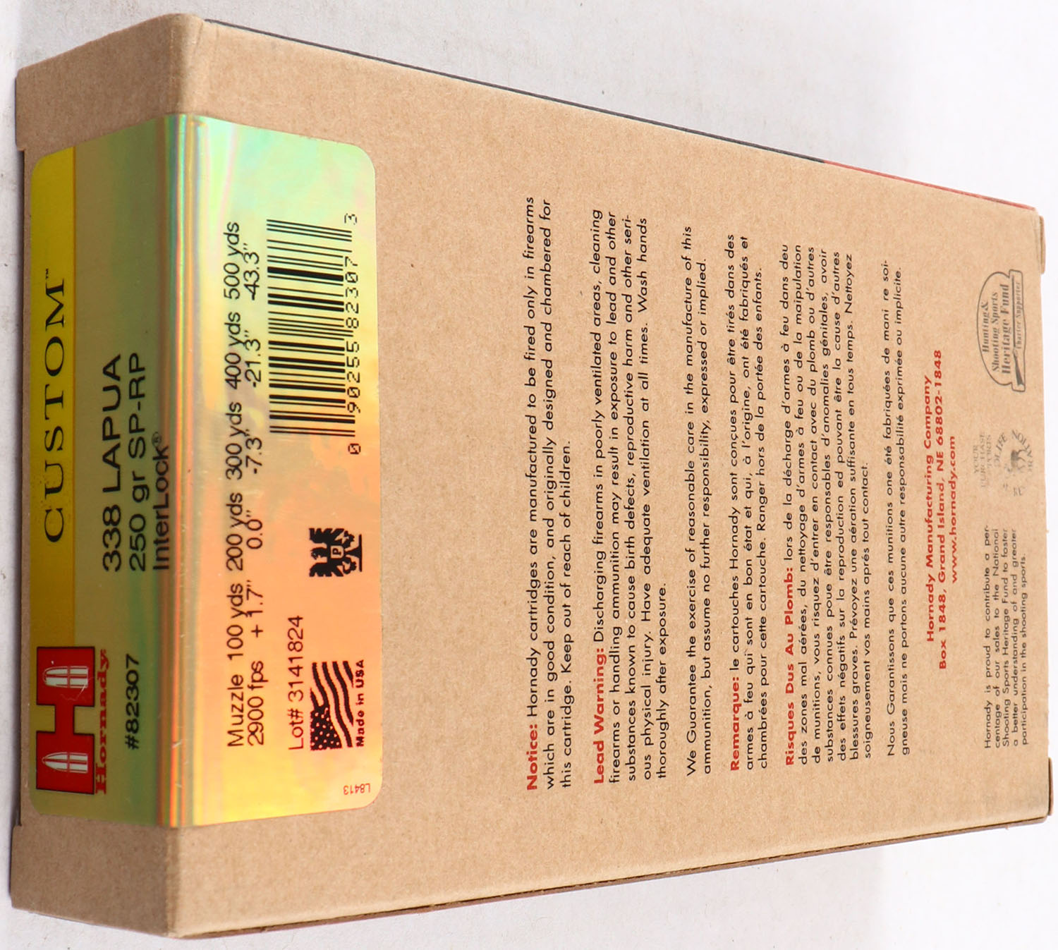 Hornady, Custom, .338 Lapua, 250 Grain SP-RP interlock, Full, 1pc. multi-colored box, box is solid with excellent color, Ammo is excellent. Grade: MINT - Value: 30 to 90