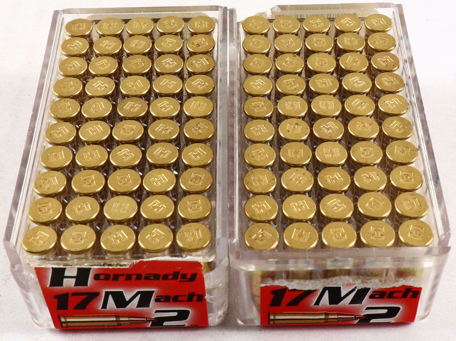 Hornady, Lot of 2, .17 Mach2, 17 Gr, V-Max Bullet, FULL, 2pc. Clear plastic tray with red label, boxes are missing top piece that includes label, Ammo is excellent. Grade: Very Good - Value: 10 to 50