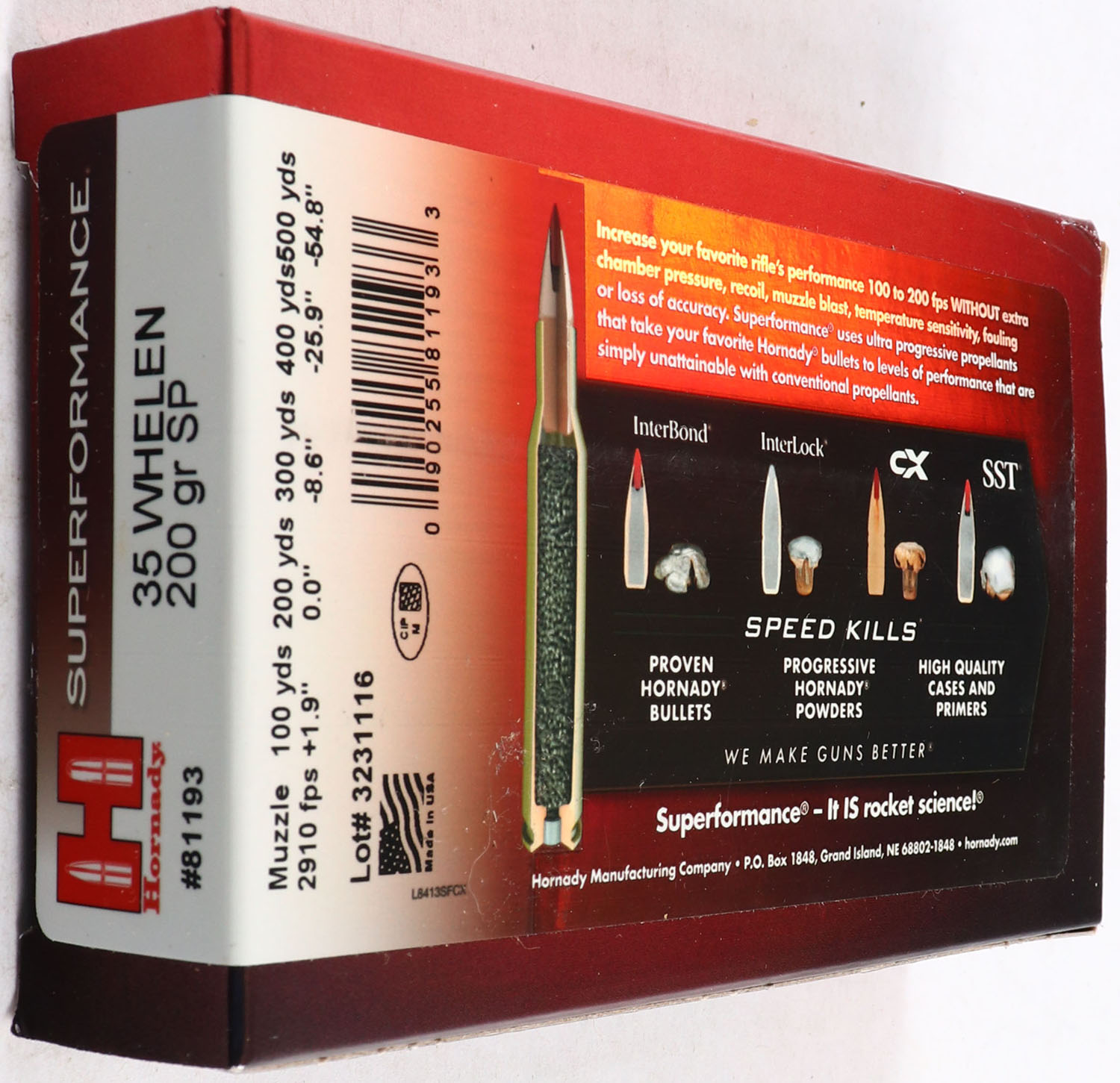 Hornady, Superformance, 35 Whelen, 200 Grain SP, Full, 1pc. multi-colored box, box is solid with excellent color, Ammo is excellent. Grade: Excellent ++ - Value: 20 to 60