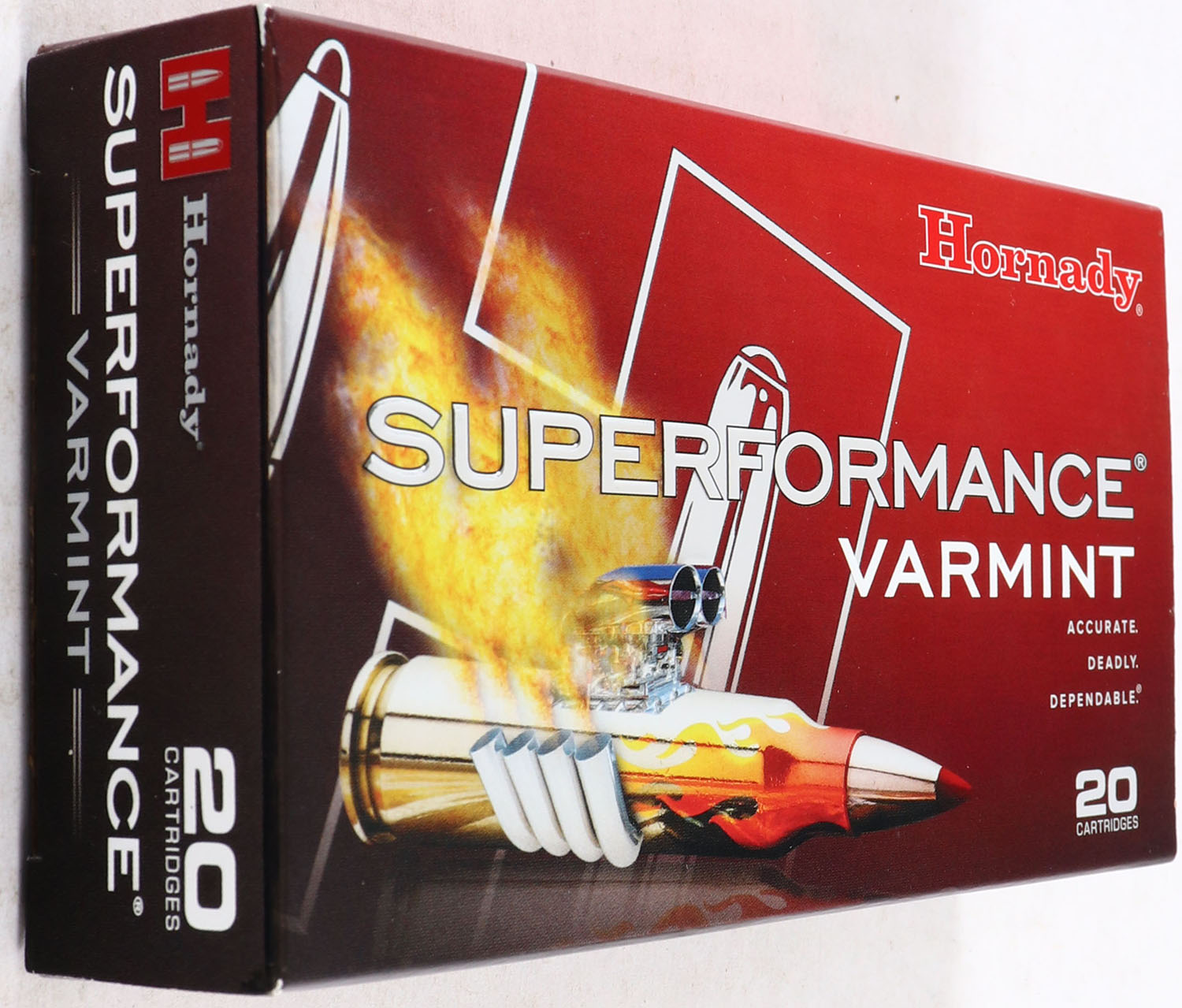 Hornady, Superformance Varmint, 22-250 Rem, 50 Grain V-MAX, Full, 1pc. multi-colored box, box is solid with excellent color, Ammo is excellent. Grade: MINT - Value: 20 to 60