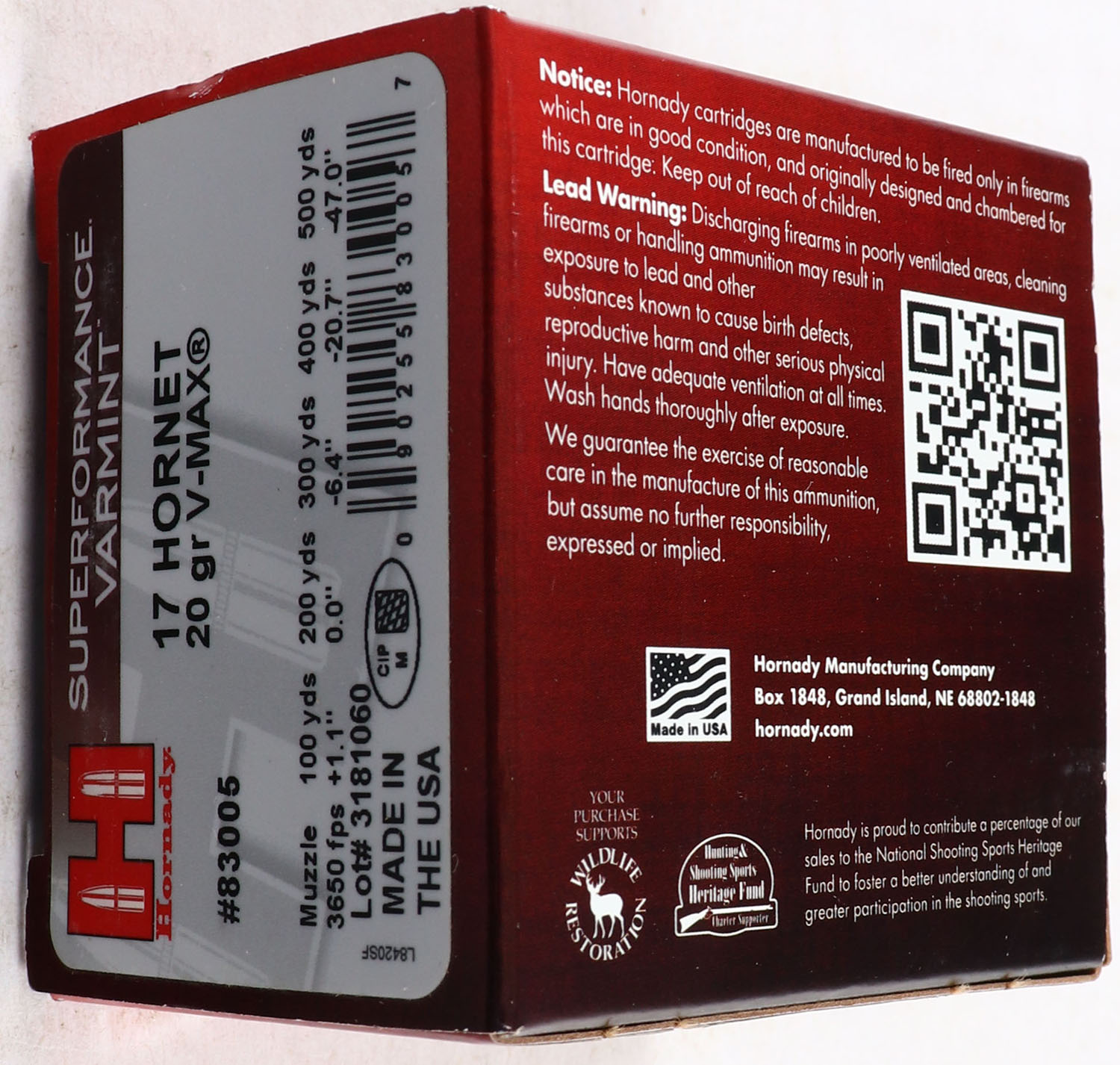 Hornady, Superformance, .17 Hornet, 20 Grain V-Max, Full, 1pc. multi-colored box, box is solid with excellent color, Ammo is minty. Grade: Excellent ++ - Value: 16 to 40