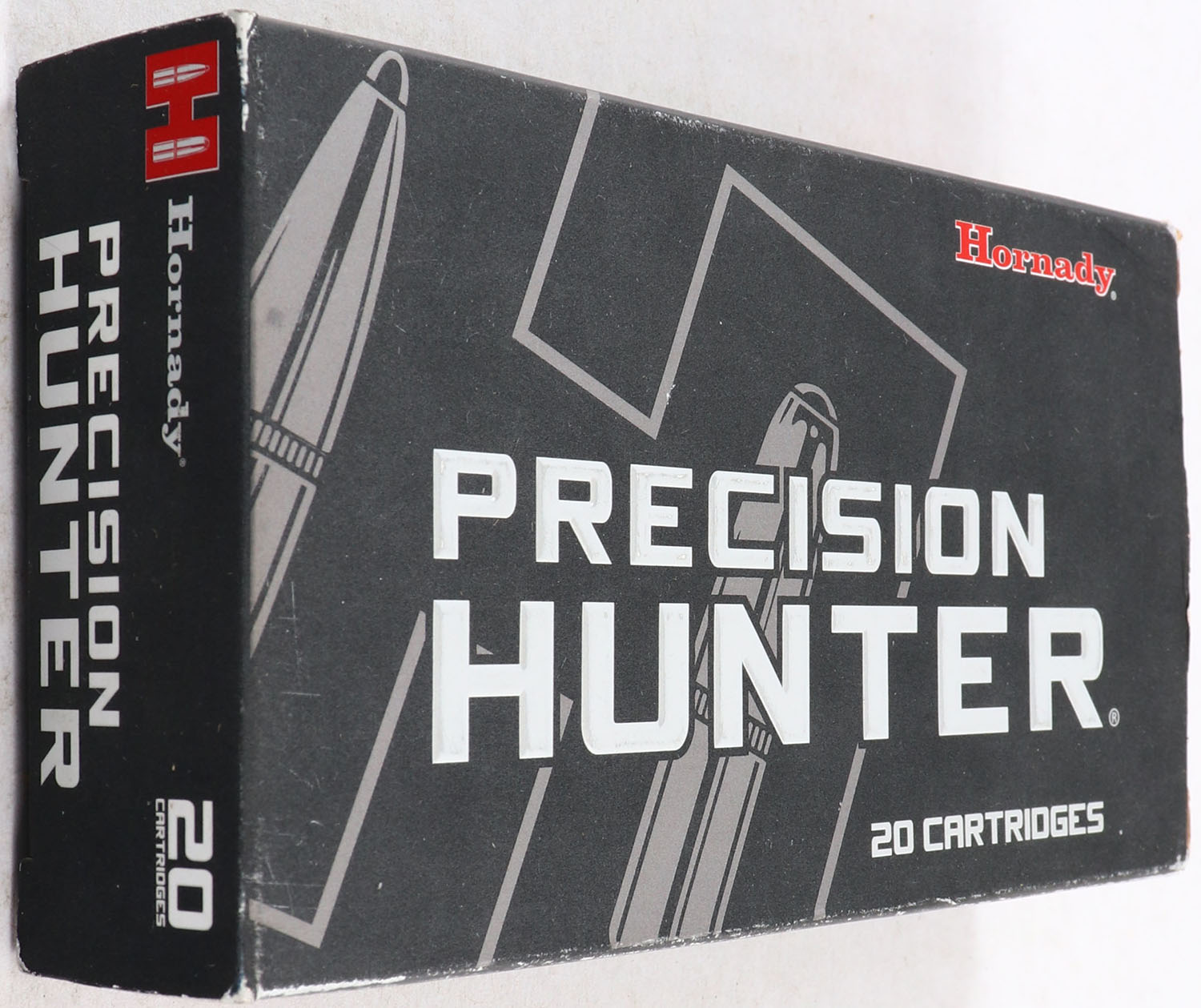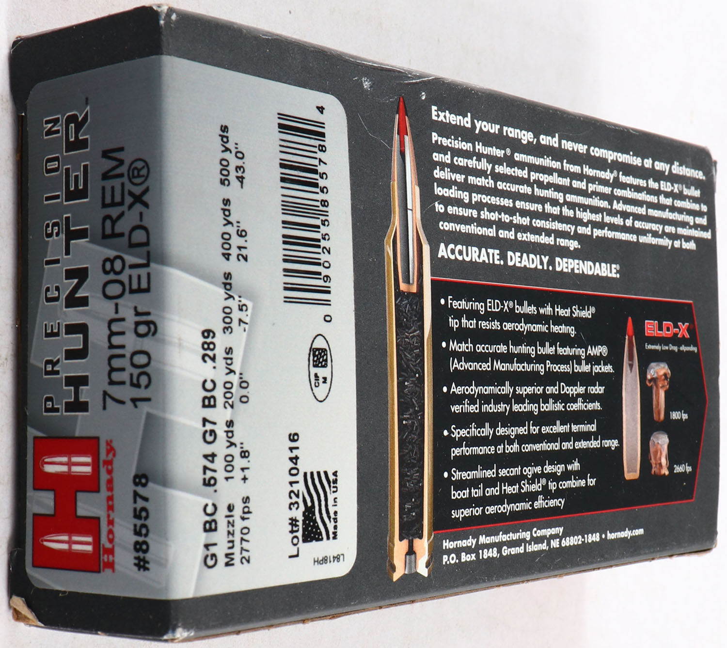 Hornady, Precision Hunter, 7mm-08 REM, 150 Grain ELD-X, Full, 1pc. multi-colored box, box is solid with excellent color, Ammo is excellent. Grade: Excellent ++ - Value: 16 to 40