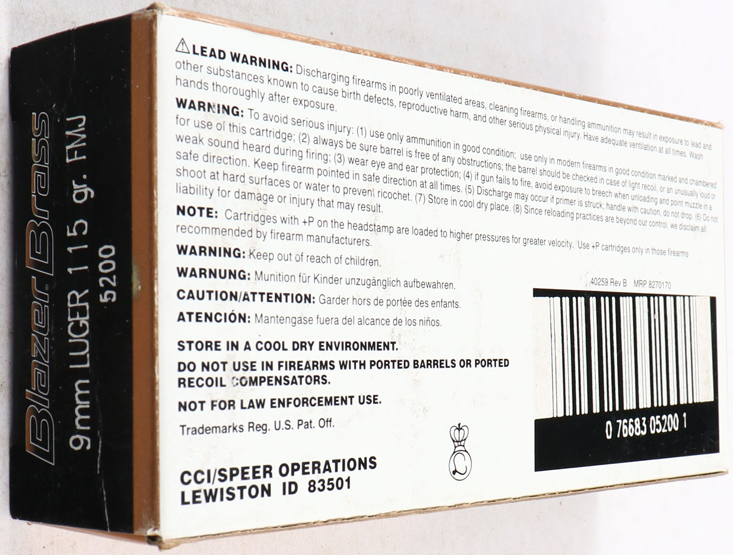 CCI, Blazer Brass, 9mm Luger, 115 Grain FMJ, Full, 1pc. multi-colored box, box is solid with excellent color, Ammo is excellent. Grade: Excellent ++ - Value: 20 to 40