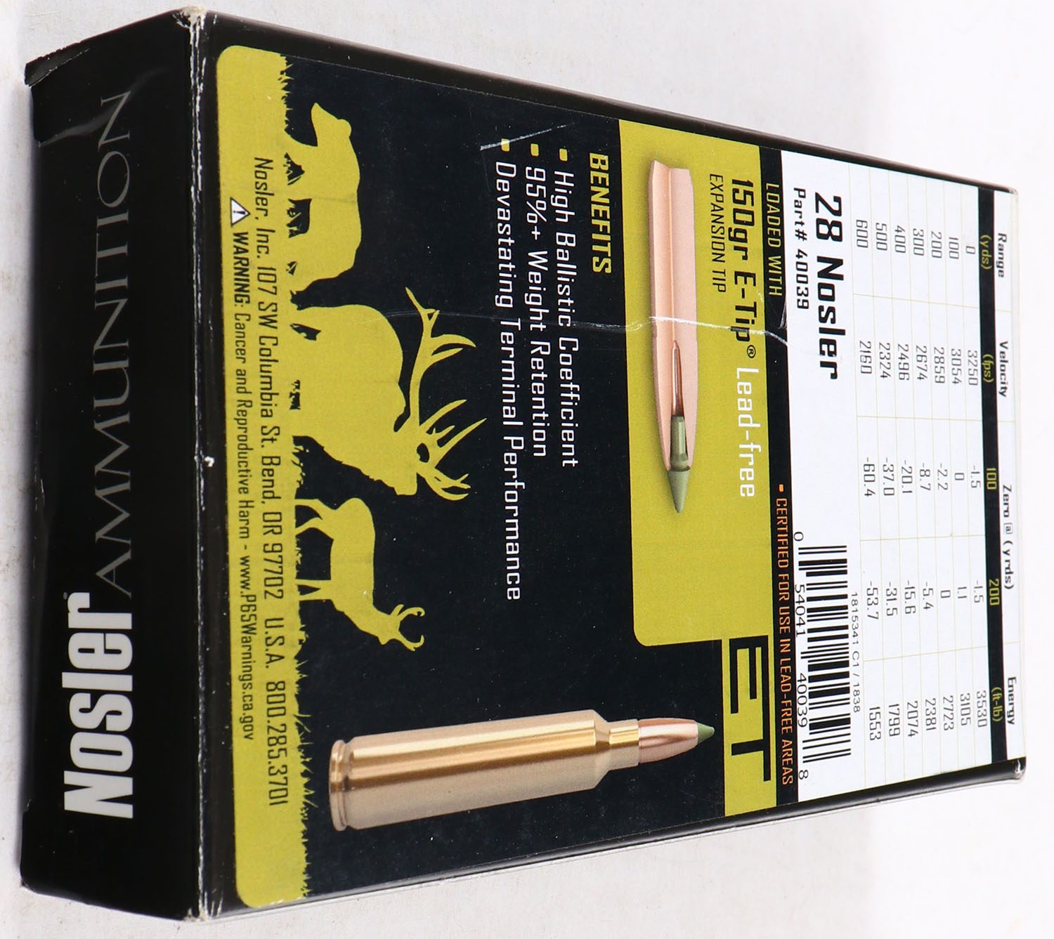 Nosler, E-TIP Lead-Free, 28 Nosler, 150 Grain, Full, 1pc. multi-colored box, box is solid with excellent color, Ammo is excellent. Grade: Excellent ++ - Value: 20 to 80