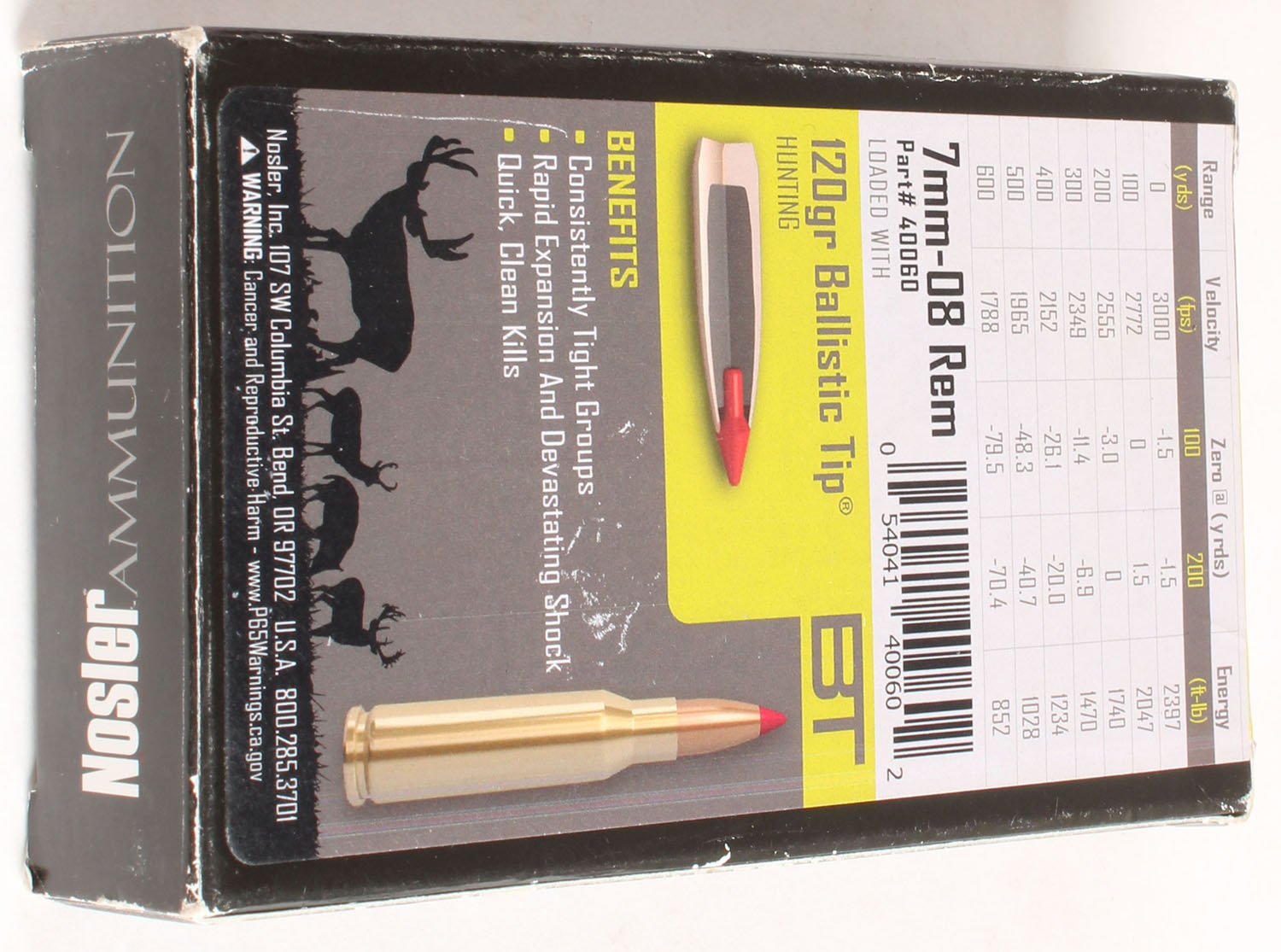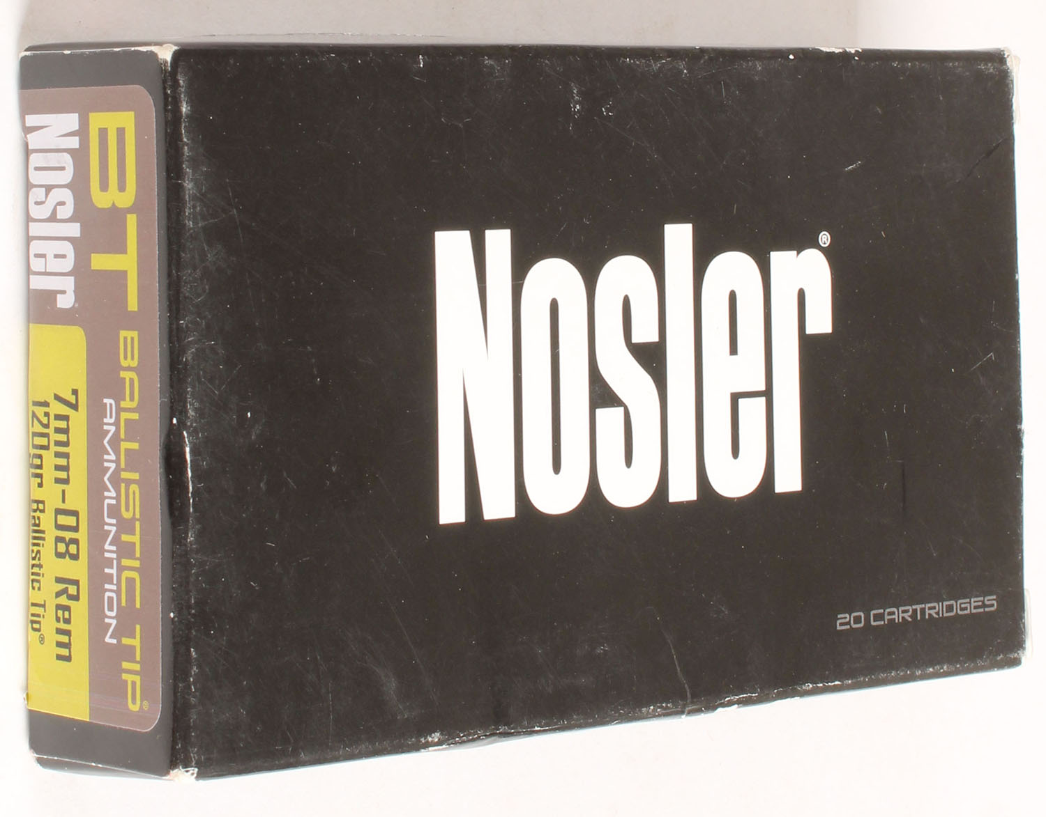 Nosler, BT(Ballistic tip), 7mm-08 Rem., 120 Grain BT, Full, 1pc. multi-colored box, box is solid with excellent color, Ammo is excellent. Grade: Excellent - Value: 20 to 60