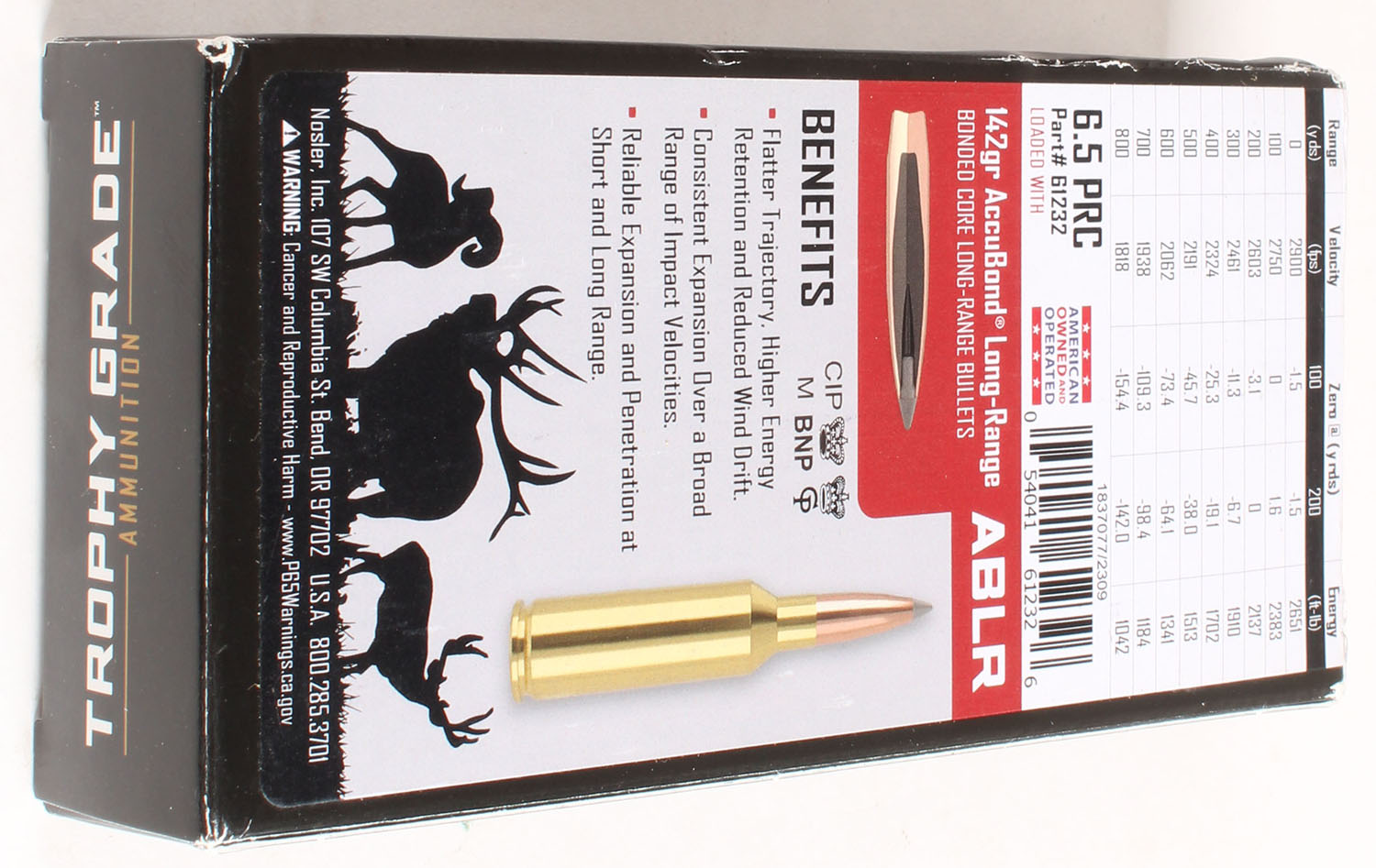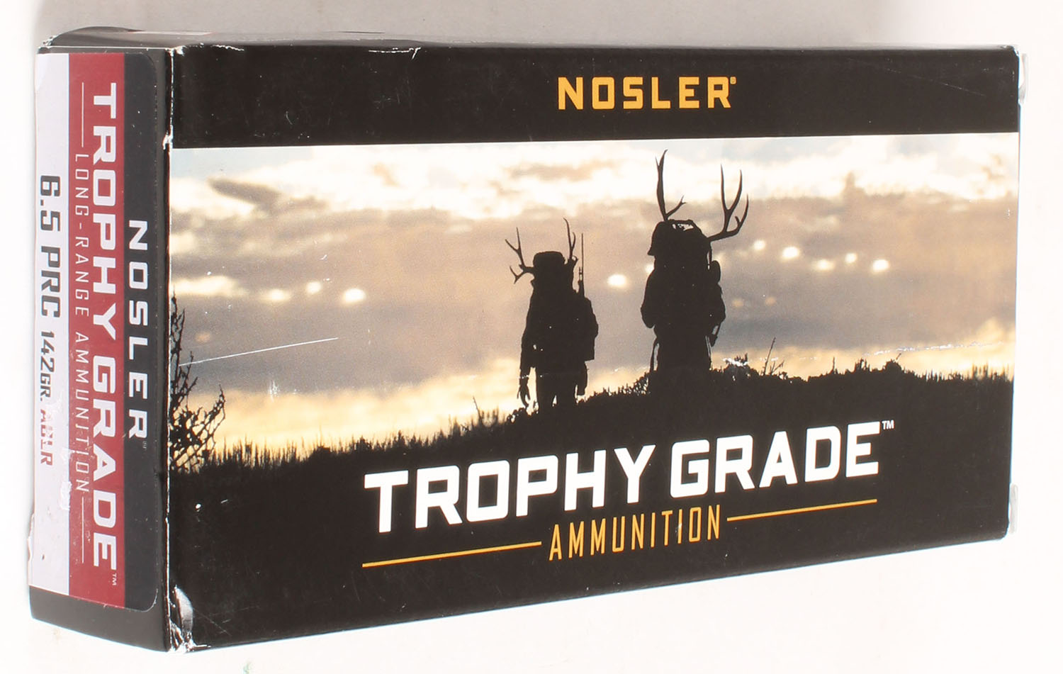Nosler, Trophy Grade, 6.5 PRC, 142 Grain ABLR, Full, 1pc. multi-colored box, box is solid with excellent color, Ammo is excellent. Grade: MINT - Value: 20 to 80