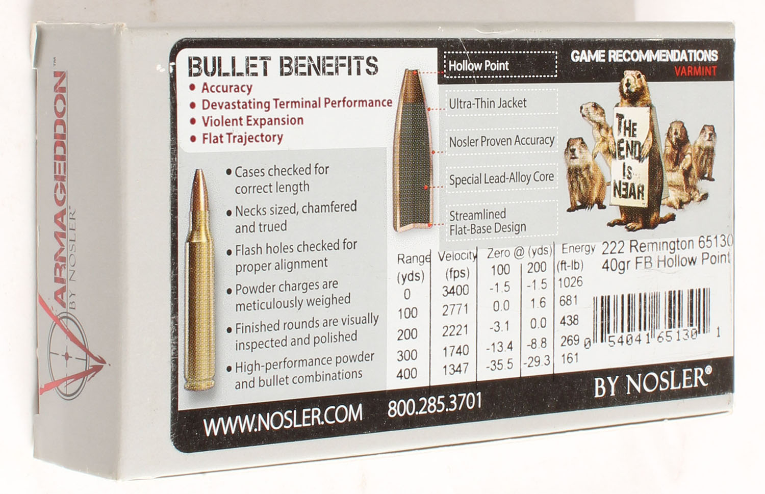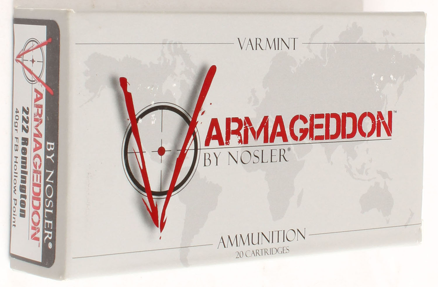 Nosler Armageddon, .222 Remington, 40 Grain FB HP, Full, 1pc. multi-colored box, box is solid, Ammo is excellent. Grade: MINT - Value: 16 to 50