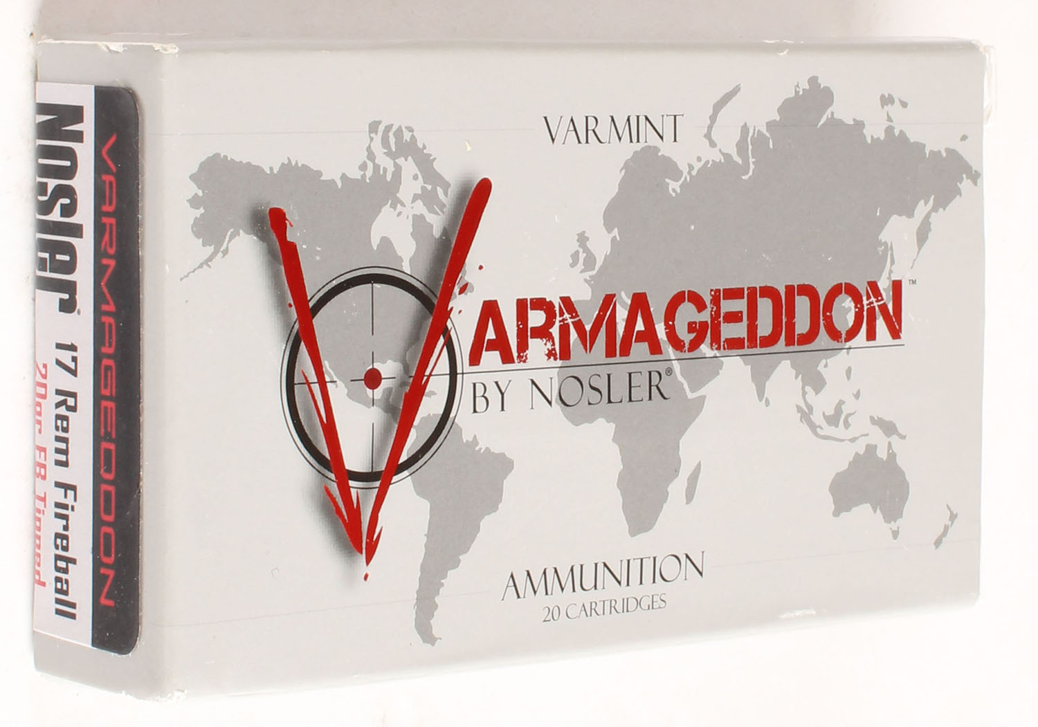 Nosler Armageddon, .17 Rem Fireball, 20 Grain FB Tipped, Full, 1pc. multi-colored box, box is solid, Ammo is excellent. Grade: MINT - Value: 16 to 50