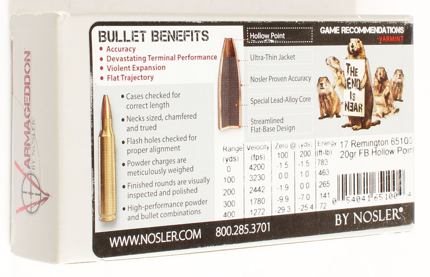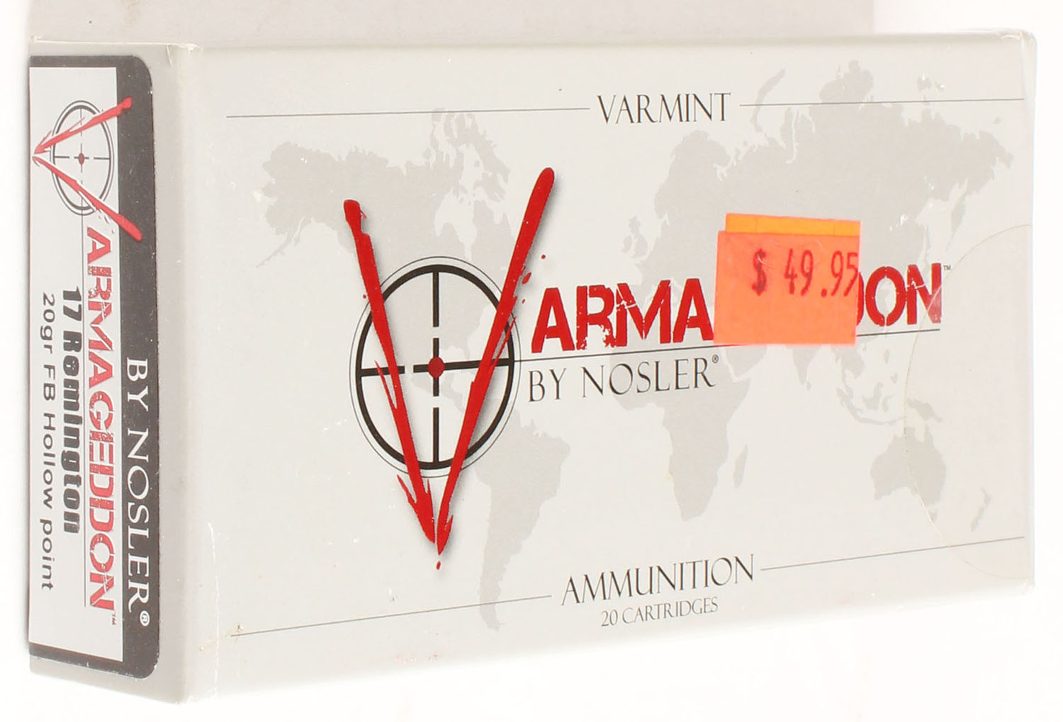 Nosler Armageddon, .17 Remington, 20 Grain FB H.P., Full, 1pc. multi-colored box, box is solid, Ammo is excellent. Grade: MINT - Value: 16 to 50