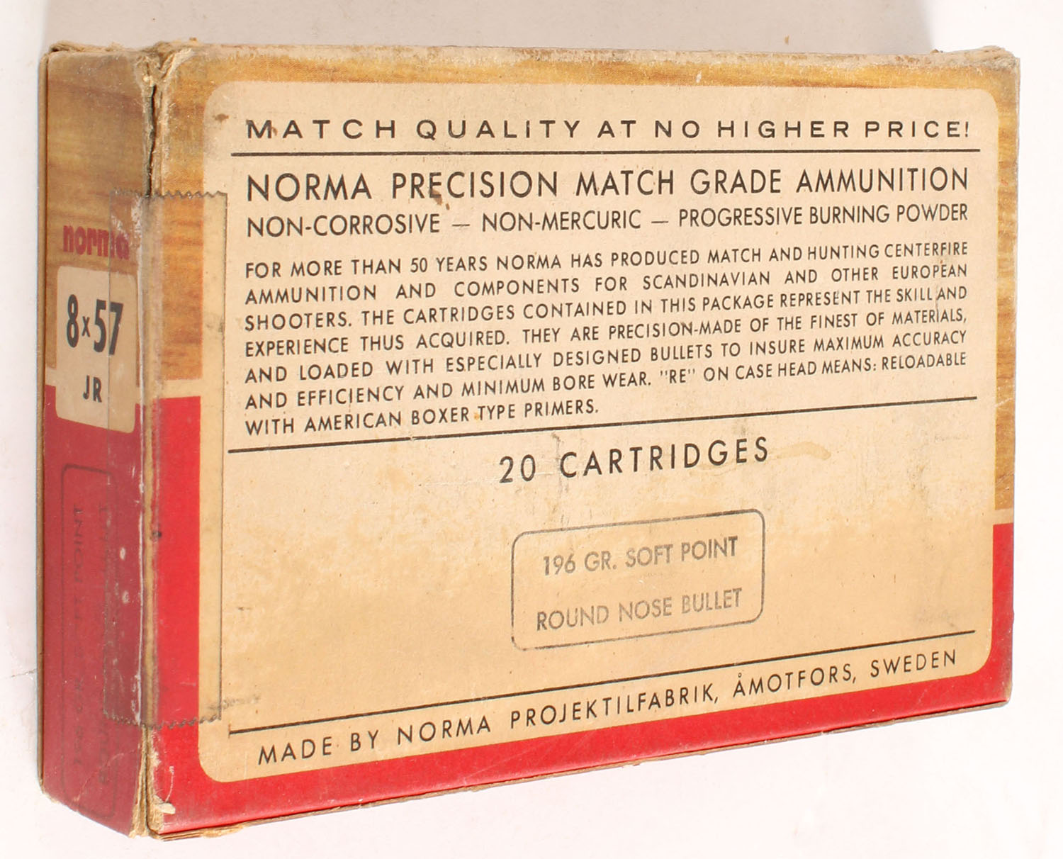 Norma, 8 x 57 JR., 196 Grains SP, Partial 19rds, 1pc. multi-colored box, box has torn left flap, Ammo is very good. Grade: Very Good + - Value: 10 to 50