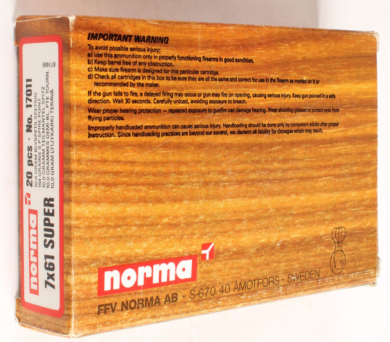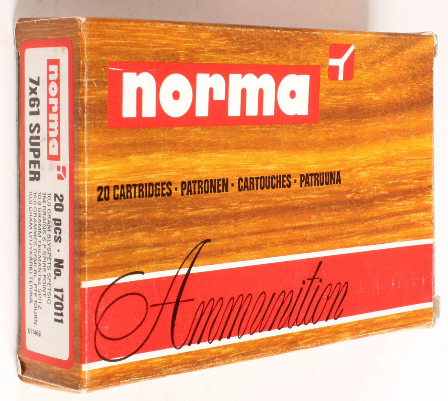 Norma, 7x61 Super, 154 Grain Spire Point, Full, 1pc. multi-colored box, box is solid, with excellent color, Ammo is minty. Grade: Excellent ++ - Value: 20 to 60