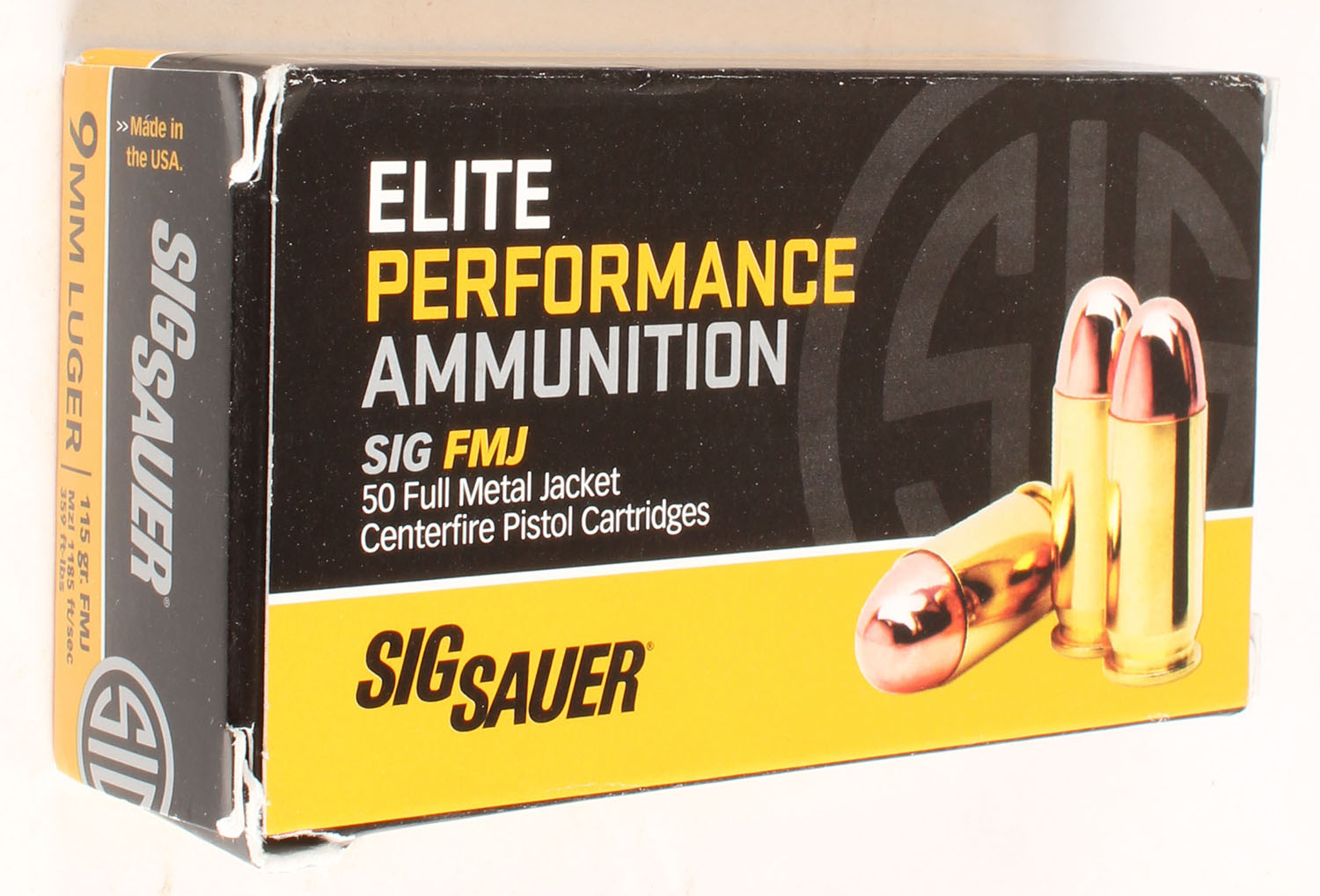 Sig Sauer, Elite Performance, 9mm luger, 115 Grain FMJ, Full, 1pc. multi-colored box, box is solid, Ammo is excellent. Grade: Excellent ++ - Value: 10 to 50