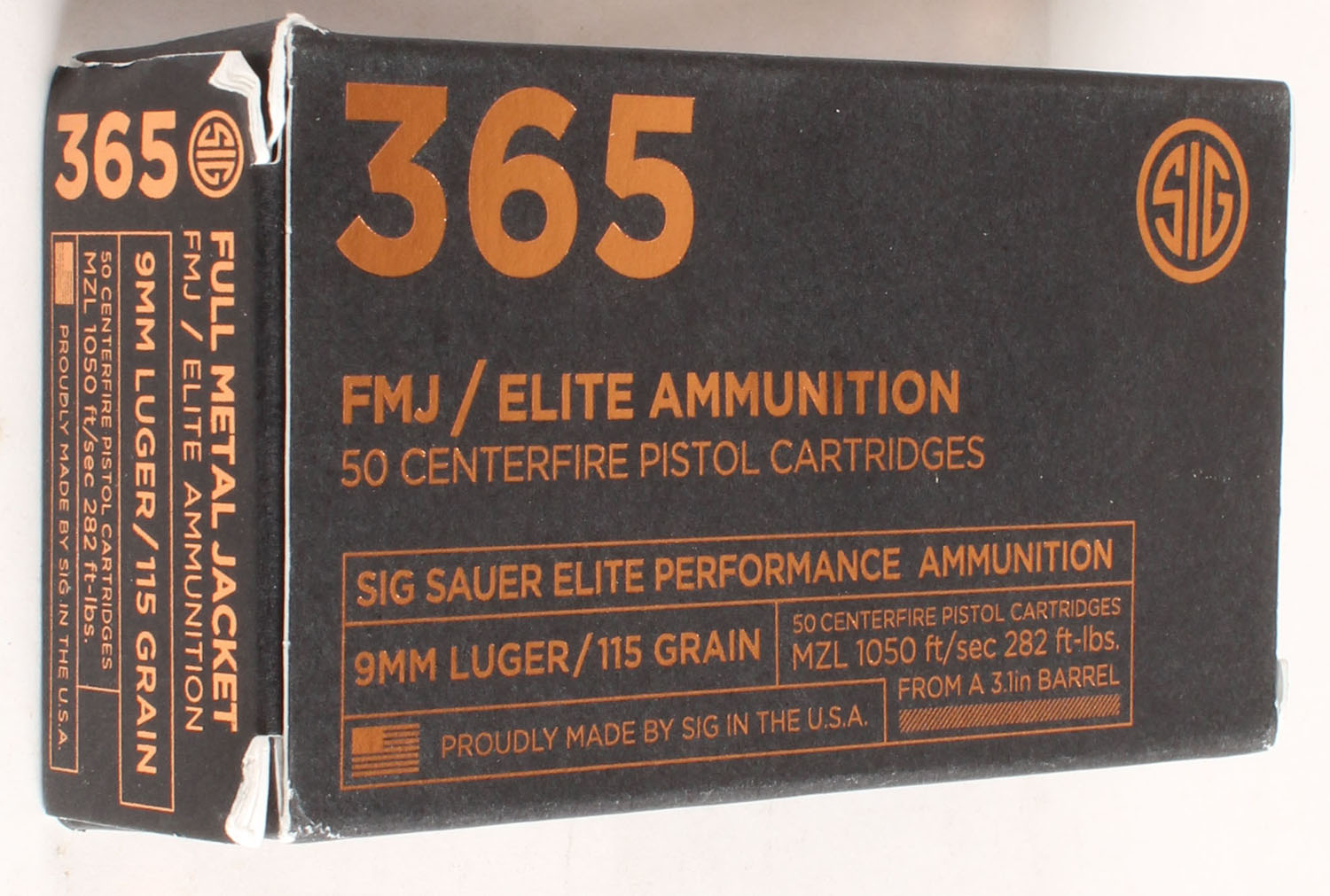 Sig Sauer, 365, Elite/FMJ, 9mm Luger, 115 Grain, Full, 1pc. multi-colored box, box is solid, Ammo is excellent. Grade: Excellent + - Value: 10 to 50