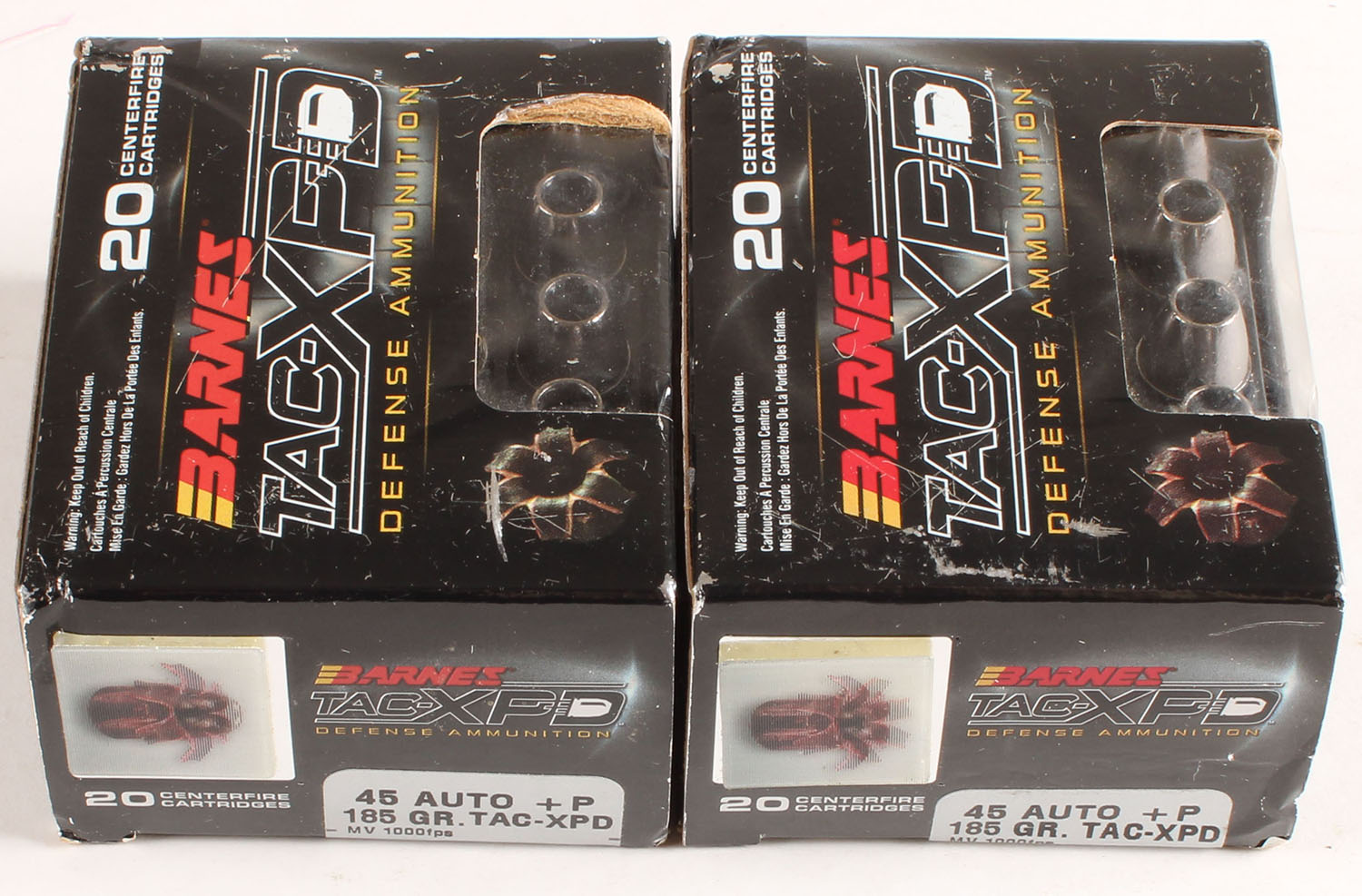 Barnes, Lot of 2, TAC-XPD, 45 Auto +P, 185 Gr., FULL & SEALED, 1pc. multi-colored box, box is solid, Ammo is excellent. Grade: Excellent + - Value: 16 to 60